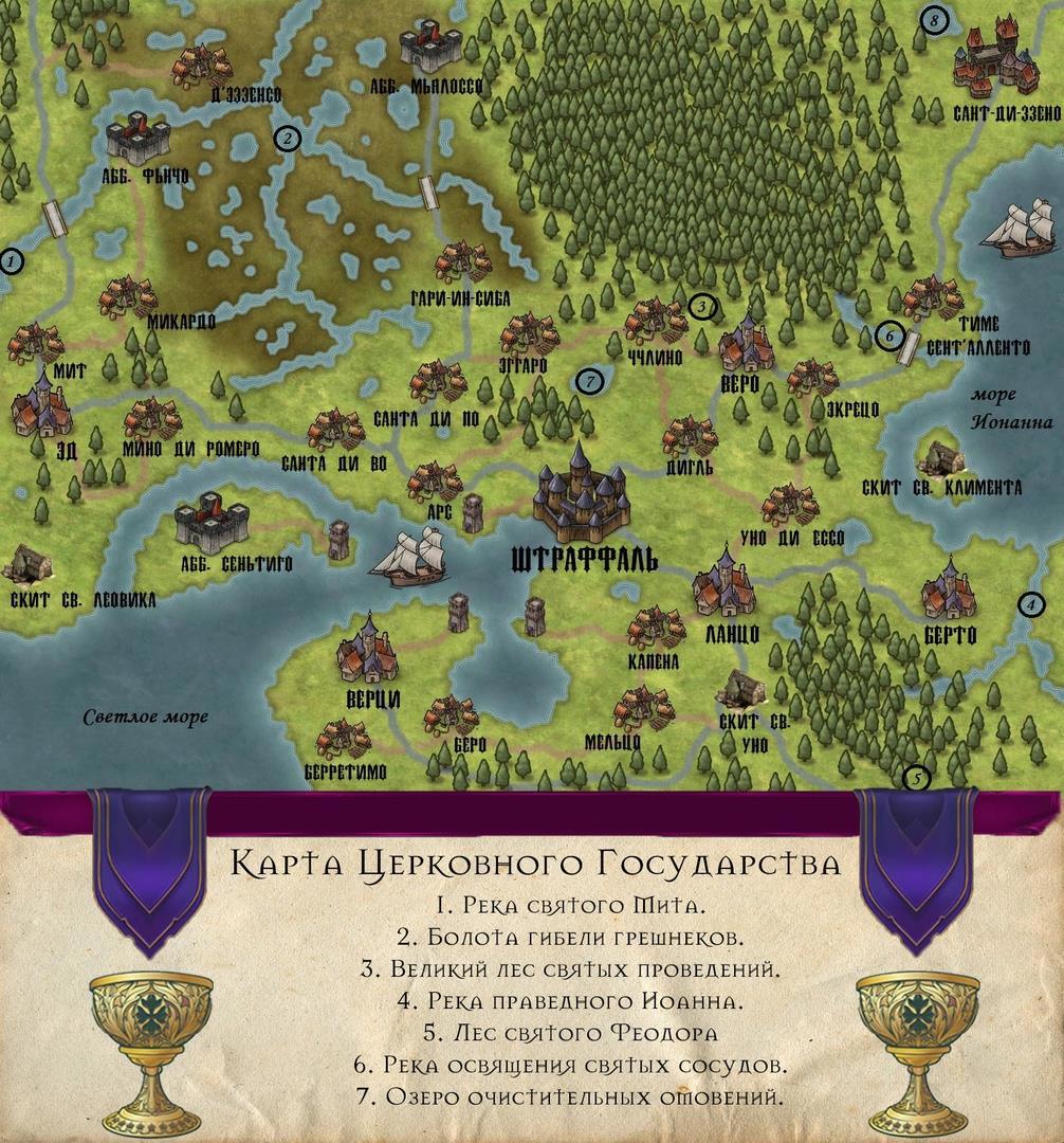 Церковное Государство - небольшое теократическое государство, где место королей, дворян и феодалов занимает могущественное духовенство. Вся жизнь граждан регулируется не законами и статутами, а церковными канонами и строками из Писаний. Правит страной, как и всей Церковью, Великий Понтифик вместе с синодом. Каждый мирянин вынужден строго подчиняться воле священства, которые чествуется с особым фанатизмом. Любое вольнодумство признаётся ересью и жестоко карается. Однако, из-за обилия святынь, где собираются немеренные пожертвования, индульгенций и выгодного положения столицы - Штраффаля, страна не бедствует. За порядком следит главная сила - Орден Света, чьи рыцари и паладины стали искусными охотниками на нечисть, нежить и разбойников. Если же спокойствие мирян нарушают ковены ведьм или еретики, то в дело вступают инквизиторы чьё присутствие заставляет неметь руки и ноги. Родиться в Церковном Государстве значить быть благочестивым мирянином, трудящимся на славу "Общины Завета" или стать отступником.