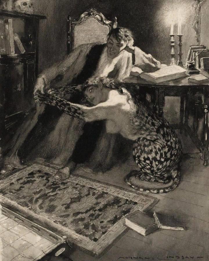 Норман Линдсей, 1910г, мужчина и женщина леопард в комнате.
