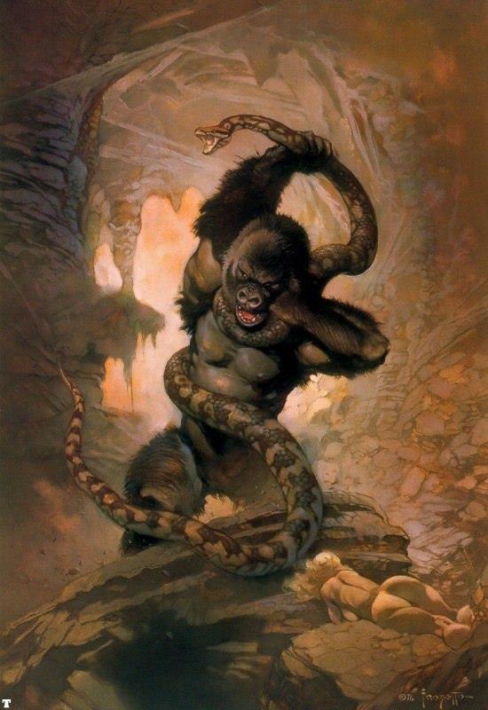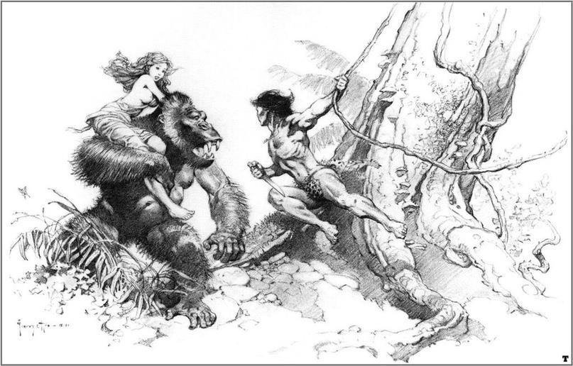 Второй любимый персонаж Берроуза, Тарзан, король джунглей, с его приключением в зеленом аду африканских джунглей, поединков с самыми страшными зверями и не менее страшными и странными созданиями также не мог обойтись без помощи Фрэнка.