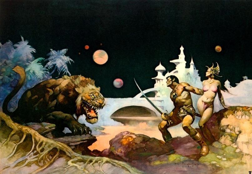 «Джон Картер (Барсум)» - рассказывающий о бывшем офицере конфедератов, попавшего на Марс и все его приключения, включая любовные, с бесподобной Дейей Торис, принцессой Барсума. Зеленые, черные, красные и прочие марсиане, жестокие сражения и опасные враги. Мог ли пройти мимо такого человек с воображением Фразетты? Думаю, что нет.