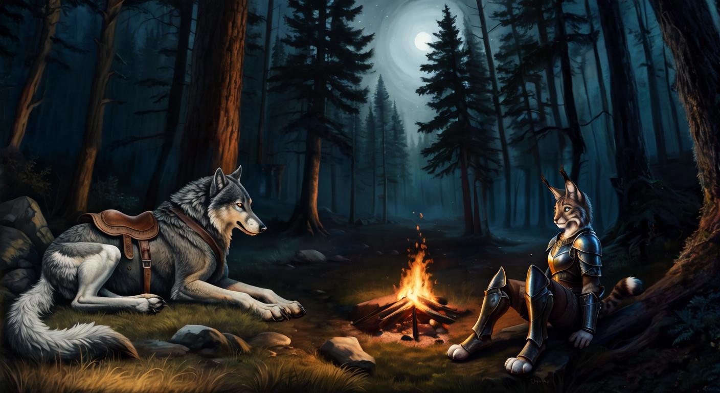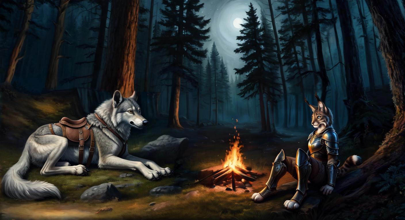 Выше я какраз сгенерировал коня, но так как подходящий вариант смотрел задницей в костёр, то пришлось его отразить. Отчего фон перестал нормально "стыковаться". И тут уже чуть поправленный фон. В начале там просто резкая граница.