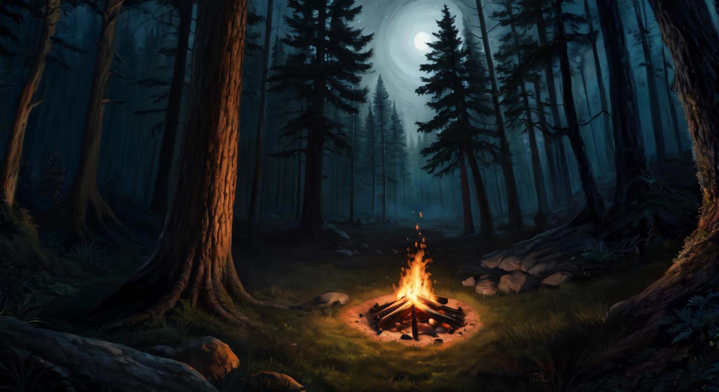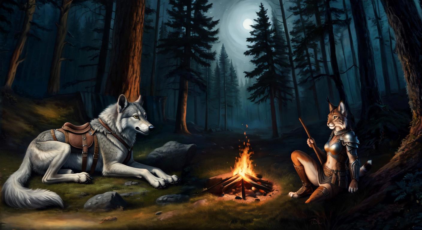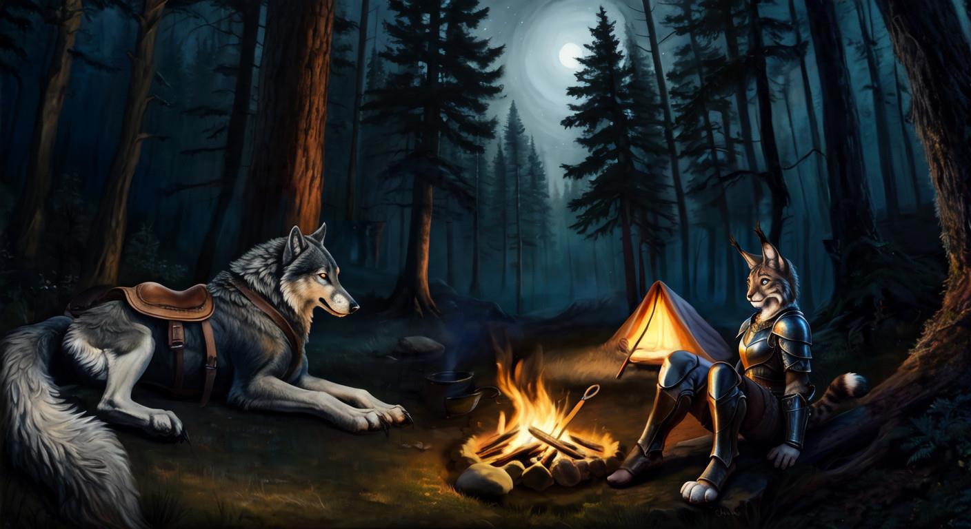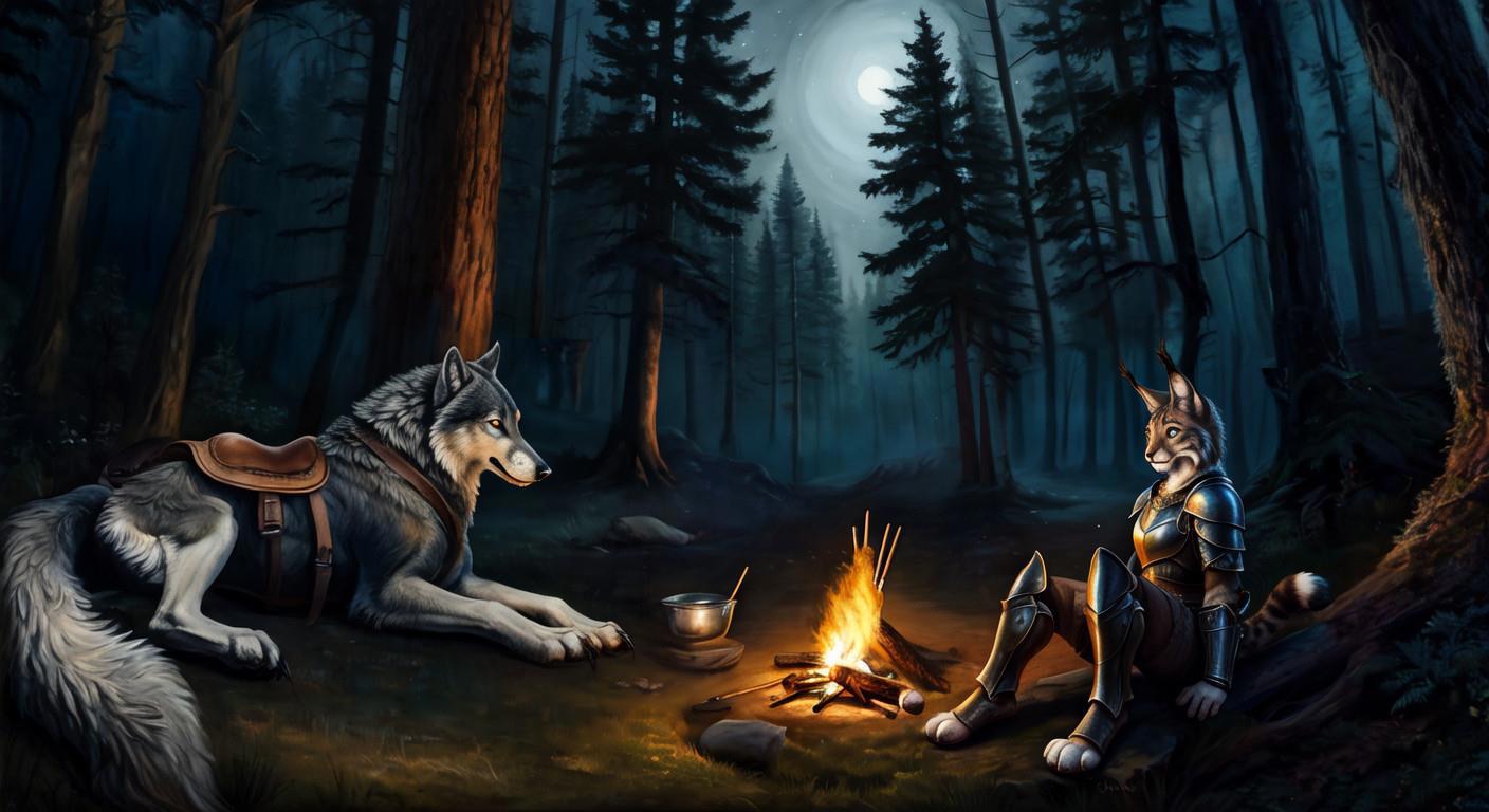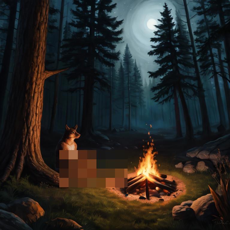 Но нейросеть не хочет ночи, она хочет фыр-фыр. Потому пришлось её снова убеждать. Параллельно я пытался сделать что-то жарящимся на вертеле. Но нейросеть такого не смогла и ограничилась котелком рядом с костром: