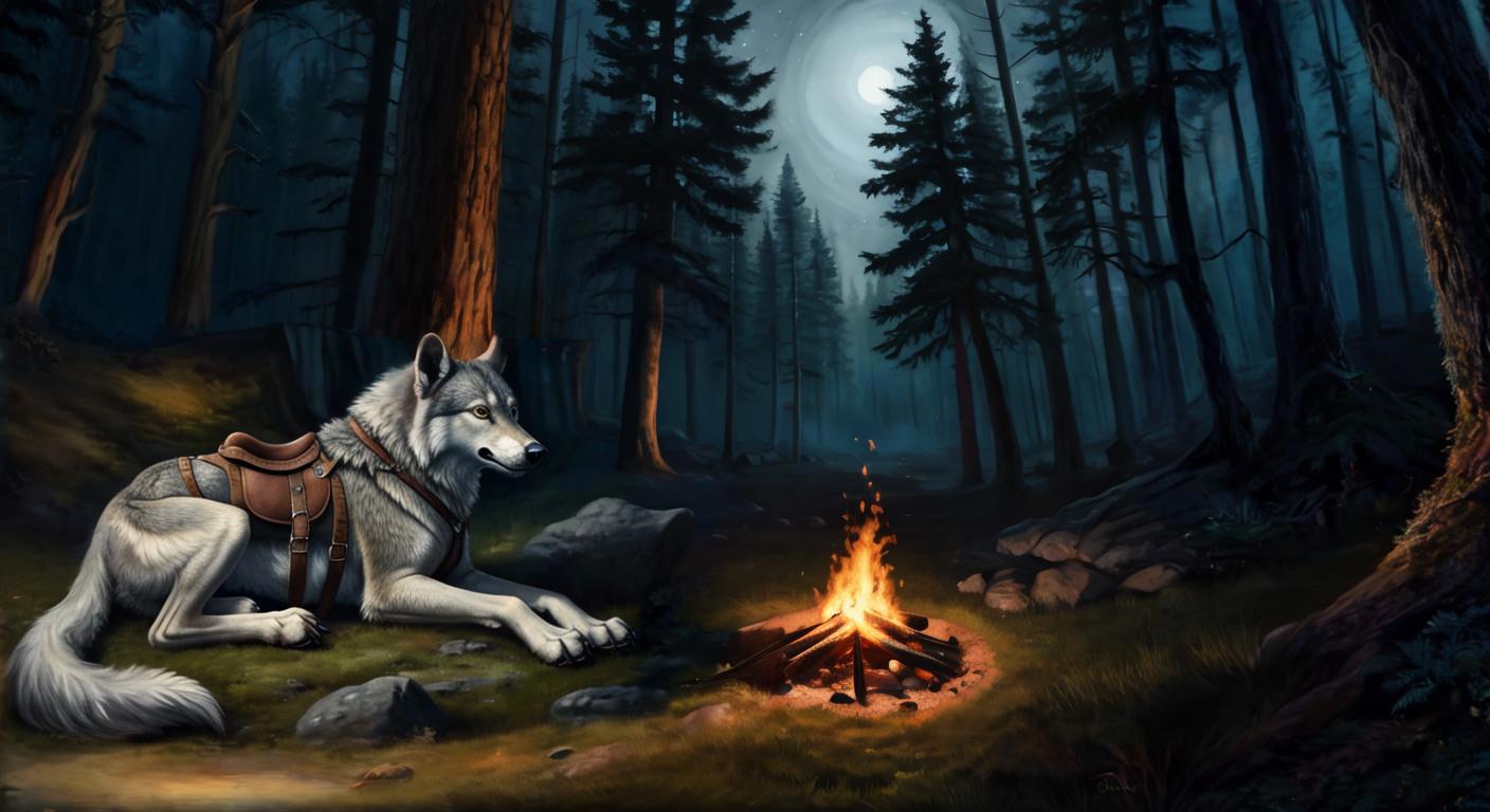 Пока я решил чуть затемнить волка, а то он лежит на солнечной полянке, и вообще смотрит не туда. Для того в outpaint есть colored brush которой можно тупо натыкать тёмных пятен куда надо, а нейросеть сообразит, что это вообще тень. Ну и в промте я немного сильнее намекнул, что вообще ночь: