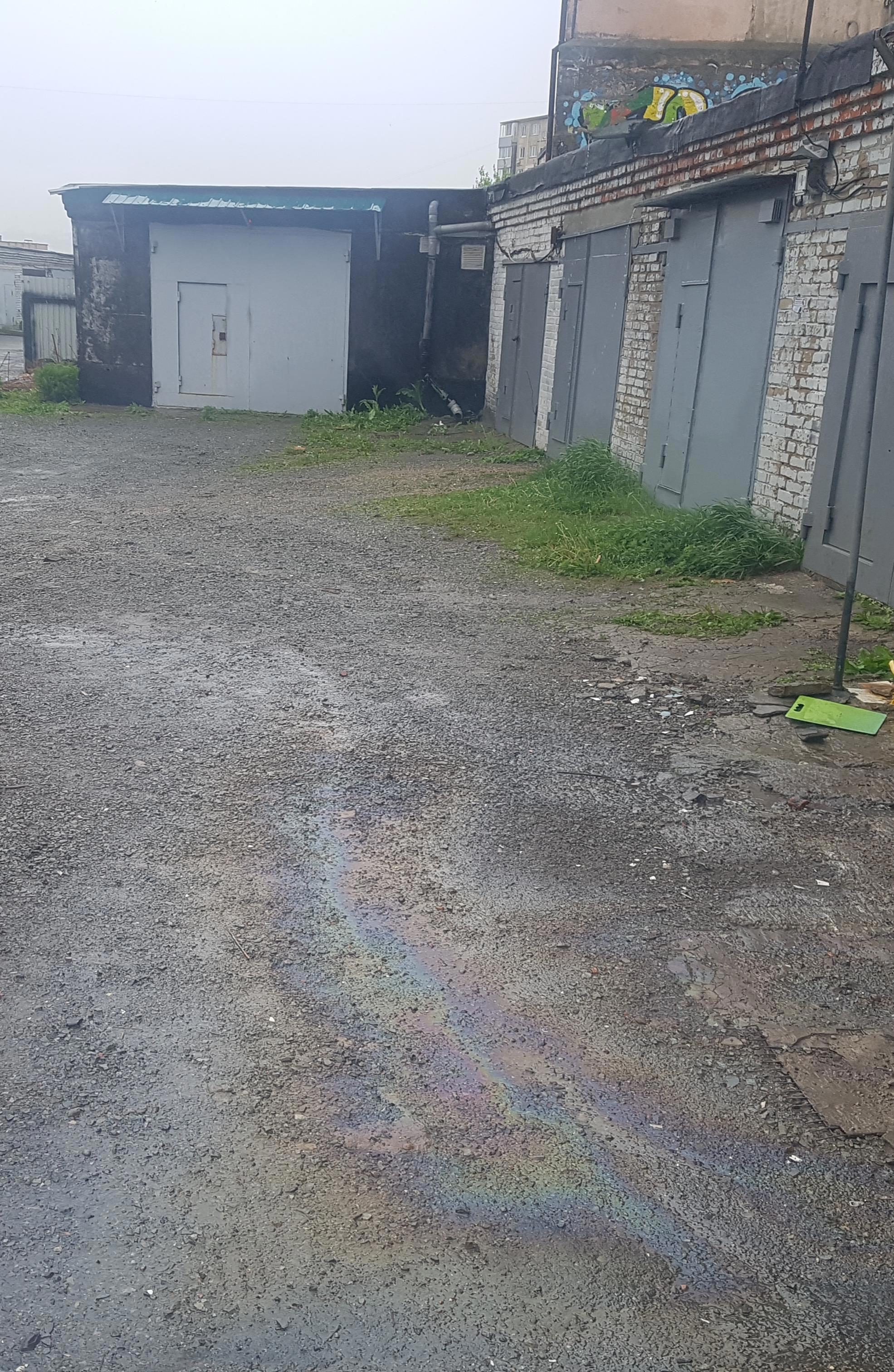Владивосток. Улицы Кирова и Енисейская. Гаражи. Свалка какая-то. Разводы от масла после дождя. А ведь был субботник недавно