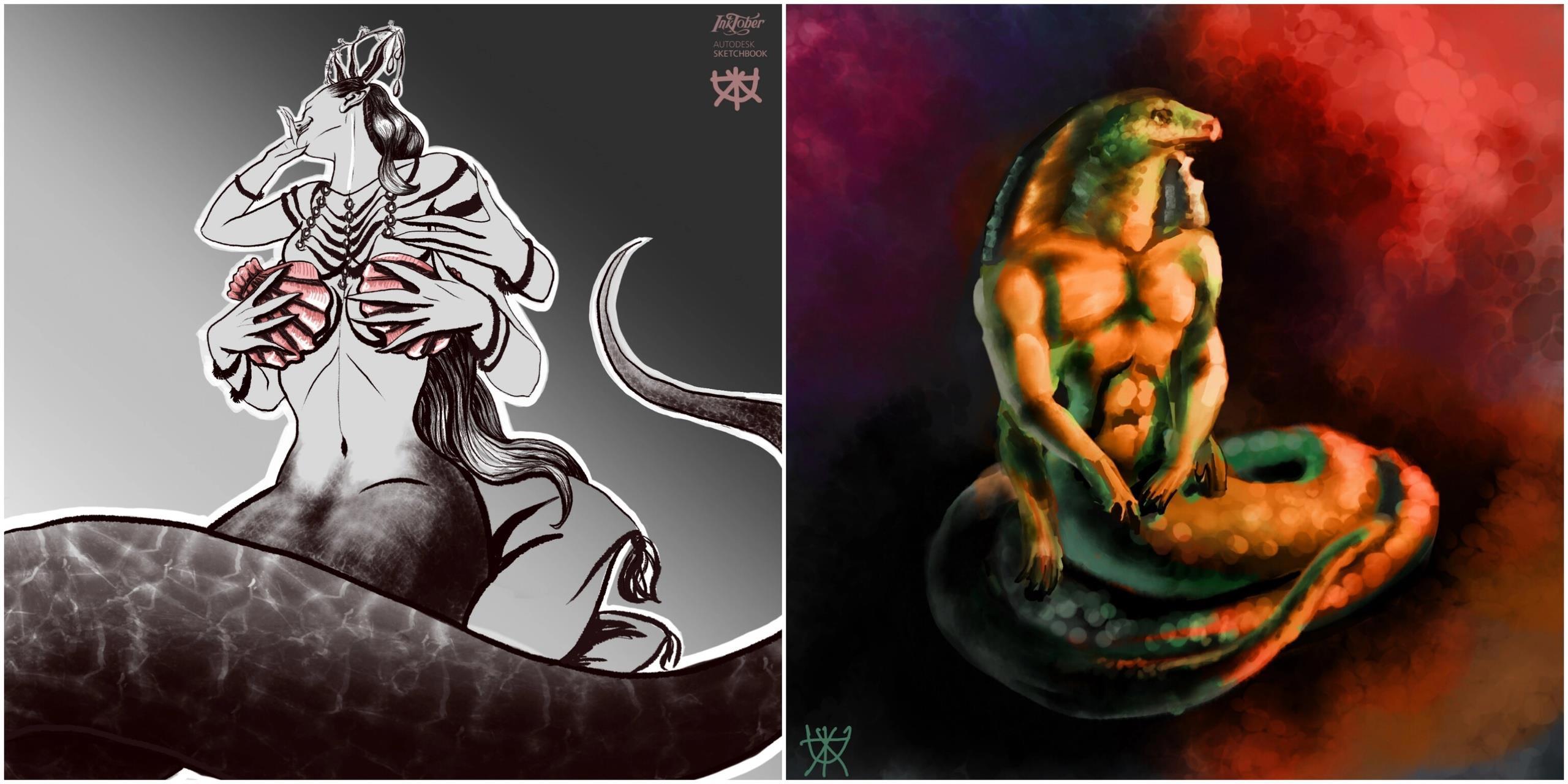 Итак в моём мире есть существа, которых обычно называют "Наги" или "змеелюды". Поскольку по гороскопу я змея, то у меня слабость к этим ребятам. В моём мире они носят название Ангуис. Женские особи имеют человеческую голову, мужские — змеиную. У истинных Ангуис по четыре руки и по змеиному хвосту. Ростом, от макушки до кончика хвоста, они могут достигать до семи метров. От цвета чешуи зависят характер и поведение. Цитата из повести "Крокодилий остров": "зелёные чуть дипломатичней, красные — выносливей, синие и белые лихо управлялись с оружием" https://author.today/work/331033