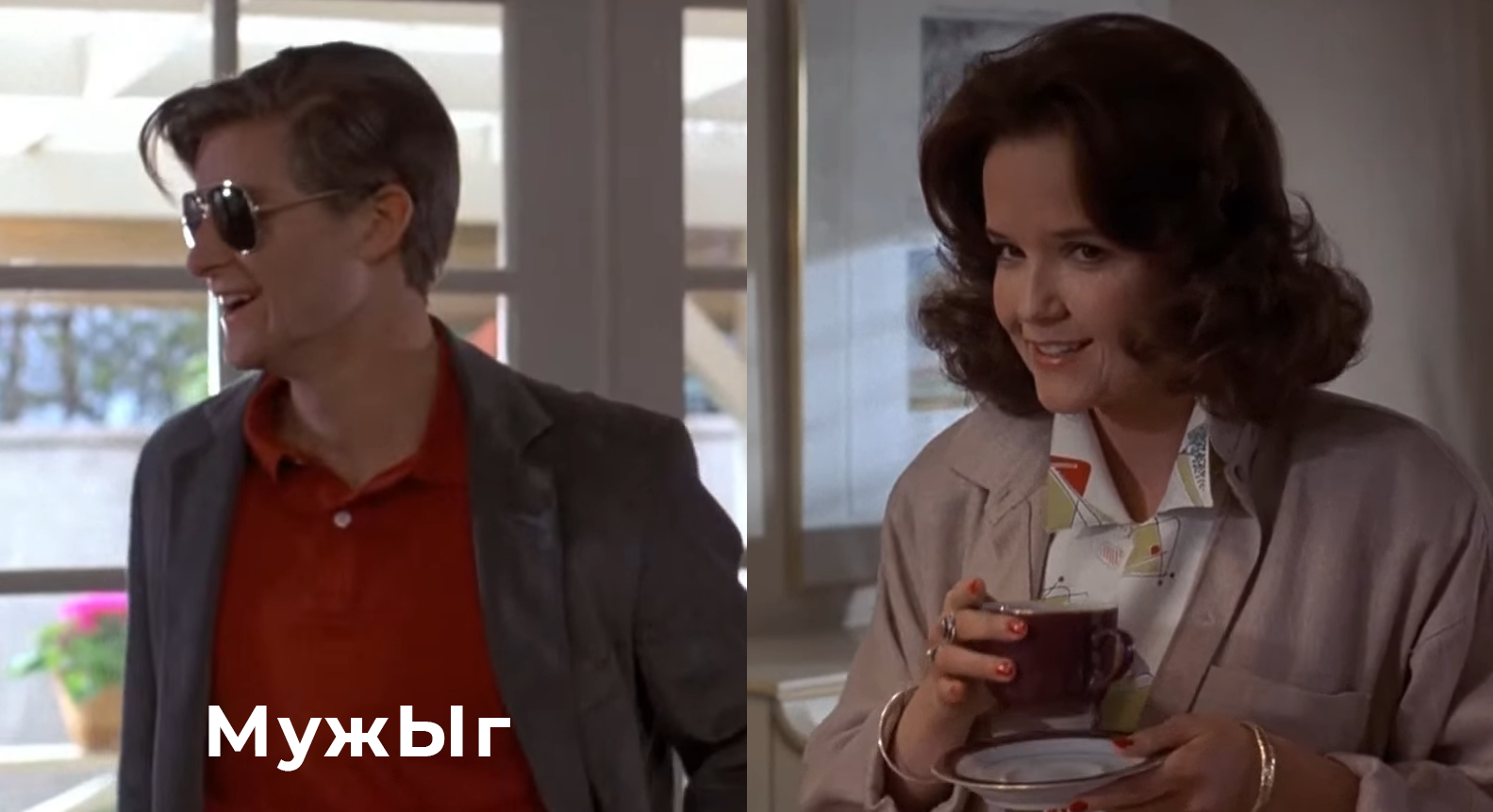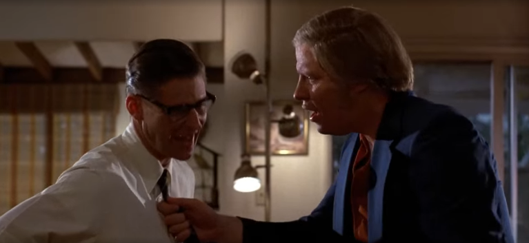 Джорджа унижает его шеф – Бифф, и мы видим, что Джордж это ну никак не мужчина, особенно когда Бифф делает ему «трунь» по носу, а тот просто смеется. Это не мужское поведение, мужик тут Бифф, а Джордж мальчик. Прямая аналогия с Марти и директором который его отчитывал – тоже служит для стыковки персонажей.