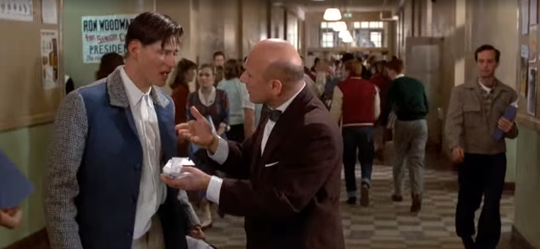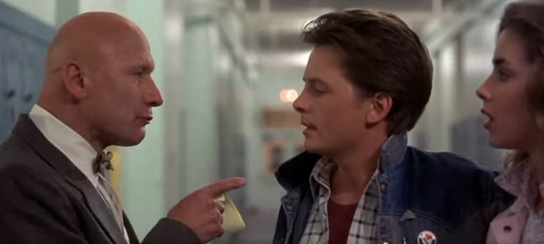 В самом начале нам обозначают "недомужественность" главного героя. Этот момент есть АБСОЛЮТНО во всех фильмах чья тема взросление. Директор школы это прямым текстом заявляет когда орет на него -"Ты как со старшими разговариваешь, оболтус" - он в позиции взрослого, Марти в позиции ребенка, на которого орут. Директор кстати, тут вообще ходит и ключевые моменты тупо вслух проговаривает, чтобы понятнее было.
