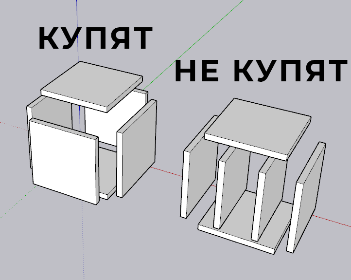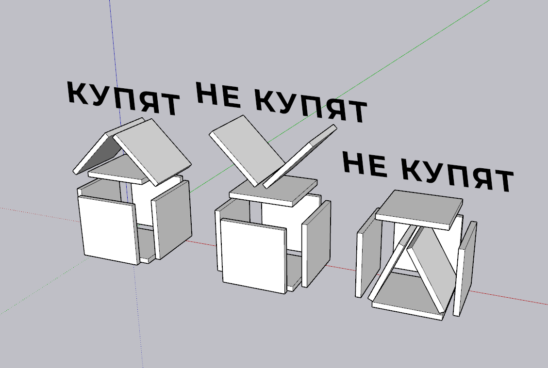 Что интересно, если поверх конструкции, поставить две вертикальных плиты под углом, чтобы они сошлись в центре, образовав перевернутую букву V – покупают еще лучше! Если такую V сделать не перевернутой – такое уже никому не надо. Мы пробовали поставить эту перевернутую V внизу, ее ведь так лучше видно, а наверху никто ее толком не видит, но почему-то покупать стали хуже. Зачем-то хотят чтобы она наверху была.
