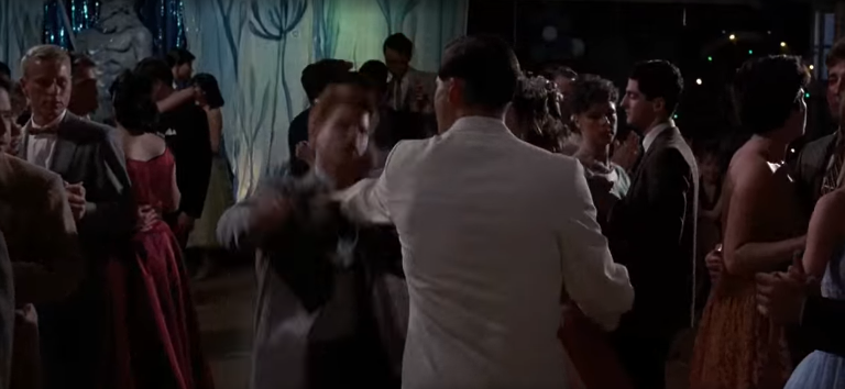 Он дает Биффу по морде, побеждает хулиганов и по итогу внедряет Лорейн важную установку, она сама ее вслух проговаривает, для совсем уж тупых - "Джордж милый и все такое, но я считаю что мужчина должен уметь защитить себя и свою женщину" - то есть буквально, озвучивает одно из основных качеств мужчины. Теперь Джорджу хочет он того или нет, но придется соответствовать. Эта сцена сюжетно, опять же не так уж и важна - от этой погони и экшена ничего по большому счету не изменилось, вот только по ее итогу Лорейн больше не сможет полюбить Джорджа пока тот мужиком не станет. Эта сцена стоит здесь потому что того требует тема.