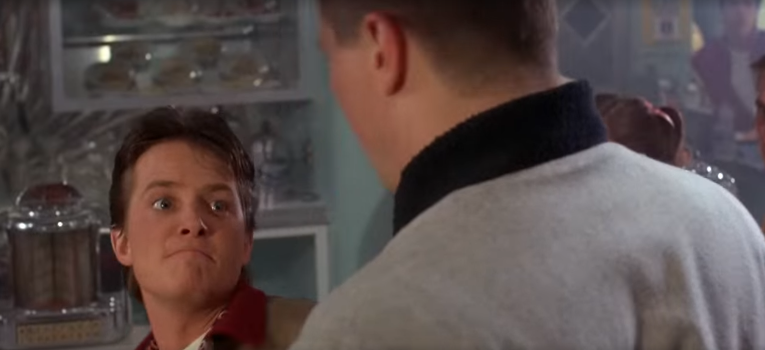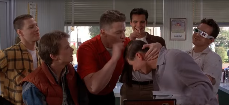 Марти заставляет отца перебороть стыд и стеснение и попытаться подкатить к Лорейн, что тот и делает запинаясь и неся какую-то околесицу, но тут в кафе входит Биф, докапывается до Джорджа, и Марти приходится влезть в драку, спасая батю. Это не просто экшн-эпизод, Марти тут работает для Джорджа отцом - показывает пример.