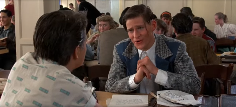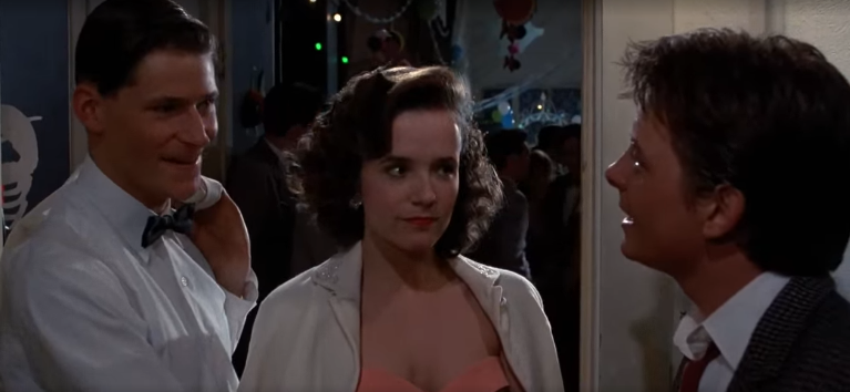 Марти пытается снова свести отца с матерью. Нам еще раз демонстрируют какое Джордж чмо, а затем директор прямым текстом озвучивает тему и главный вопрос фильма - "соберись парень, ты оболтус, до конца жизни хочешь им быть?" - то есть буквально говорит что ему нужно повзрослеть. Лорейн на Джорджа внимания не обращает, она уже влюбилась в Марти и теперь схалявить не выйдет.