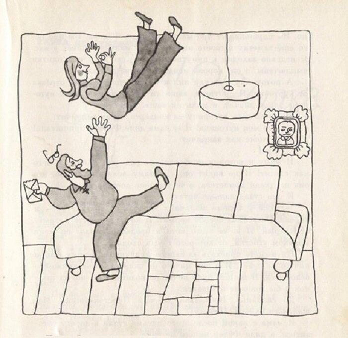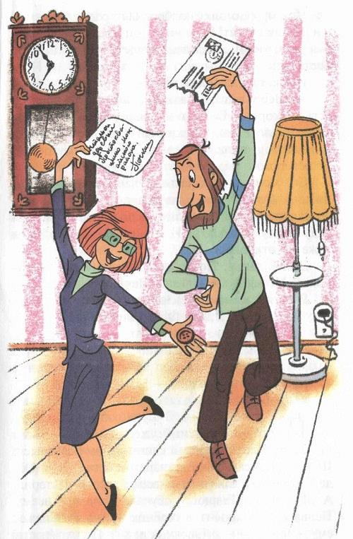И маму к потолку подбросил от радости. А очки у него как слетят! И не видит он, где маму ловить. Хорошо, что она на диван прилетела, а то бы папе досталось".