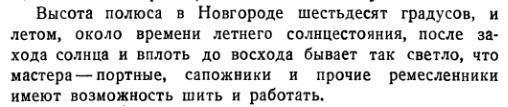 Более того, у Меховского есть описание "белых ночей", когда мастера и ремесленники имеют возможность работать даже ночью. Так вот, в Великом Новгороде ничего подобного нет. Там хоть и есть некий аналог Питерских белых ночей, но работать уже ремесленникам они не позволяют, а вот в Питере, пусть хоть и условно, но в полночь поработать уже можно. Конечно, будет темновато, но работать можно.