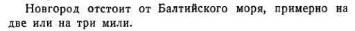 Понятно, что координаты Меховский давал приблизительные, плюс-минус километр, но они очень сильно отличаются от координат современного Новгорода, который находится в 200 километрах (27 германских миль) от моря и на широте в 58,5 градусов.