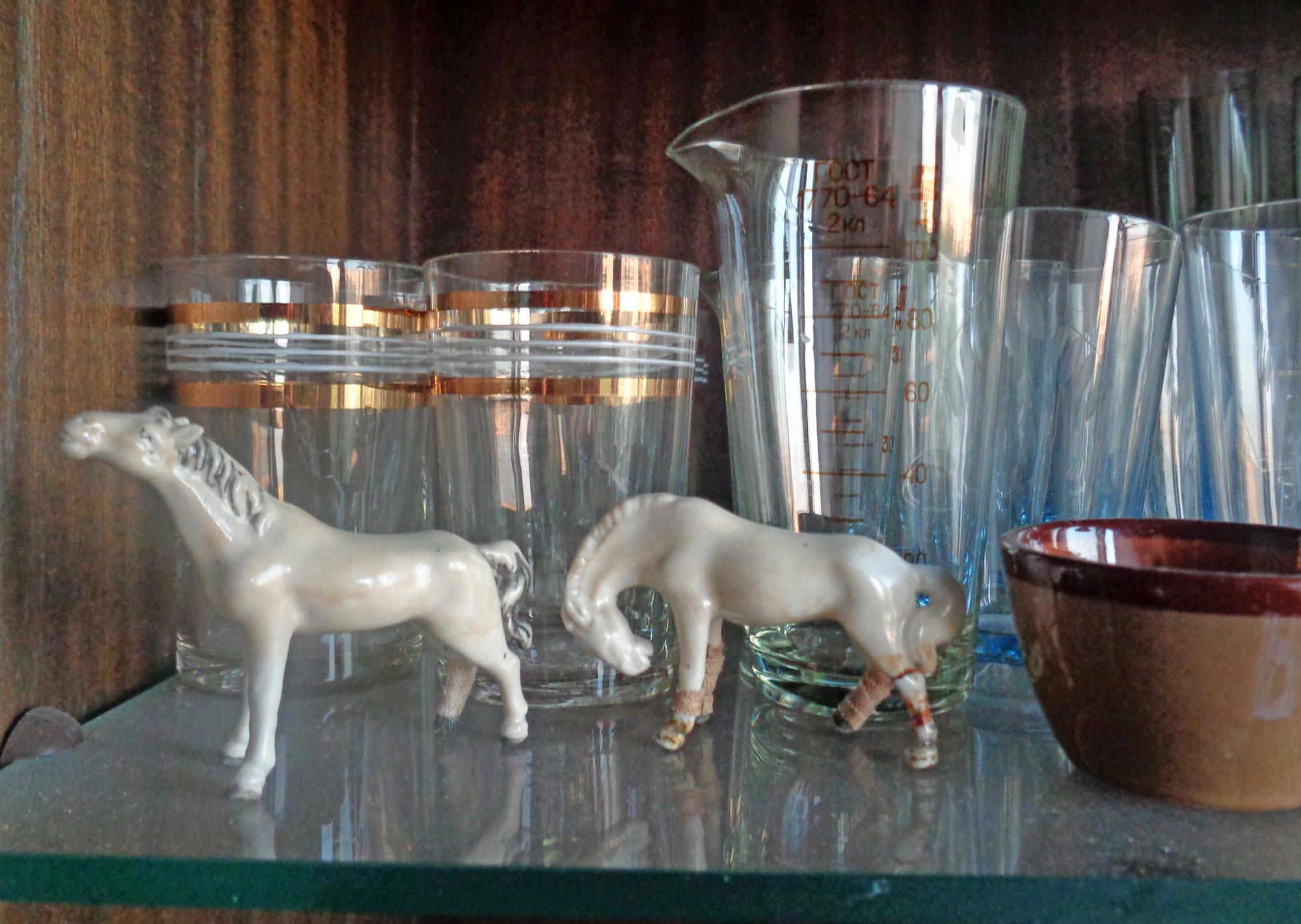 А прямо над ней - мои несчастные лошадки. Мне их отдали в детстве (моём, не лошадок), потому что у них ножки были разбиты. Я склеила кусочки, которые были, а где не было - примотала пластырем спички. И стали у них новые ножки)) До сих пор на них стоят.