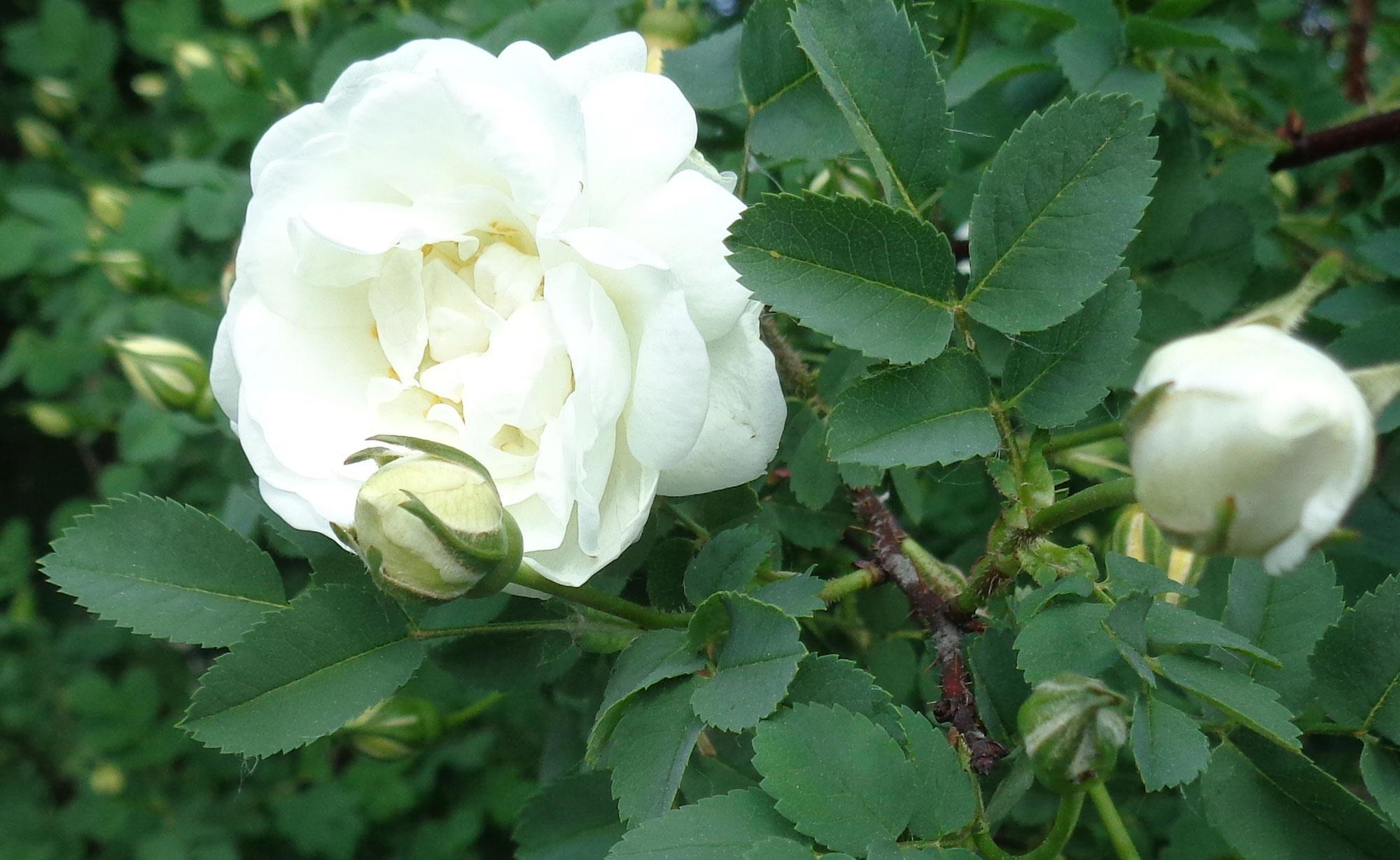 Белый шиповник зацветает, хотя ему ещё рано. Жарко!