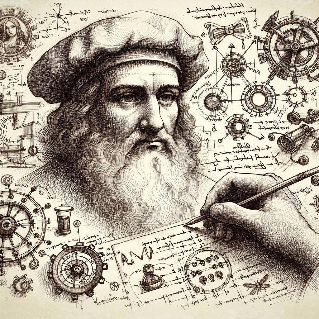 Одной из ключевых техник, которую использовал Леонардо, был метод "Скетч-карты". Этот подход заключался в создании множества зарисовок, набросков и схематических рисунков для визуализации своих идей и открытий. Его наброски служили своего рода картами, помогавшими развивать и воплощать концепции в жизнь. В генерировании идей Леонардо часто полагался на подсознание — брал лист бумаги, закрывал глаза и выводил разнообразные узоры и штрихи, а затем пытался проанализировать увиденное.