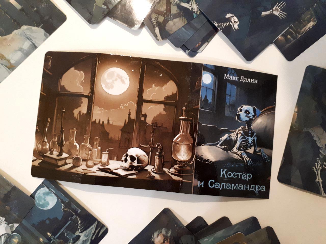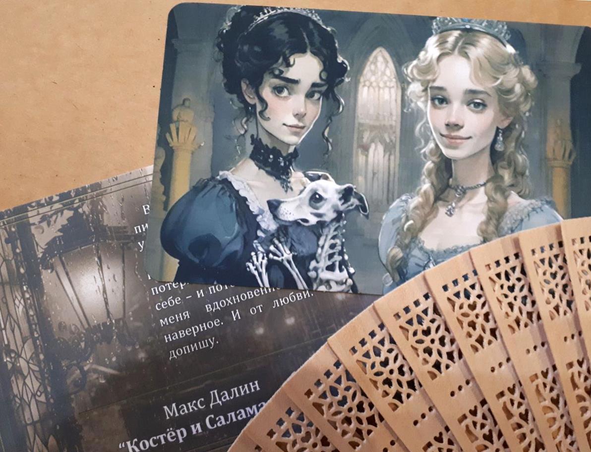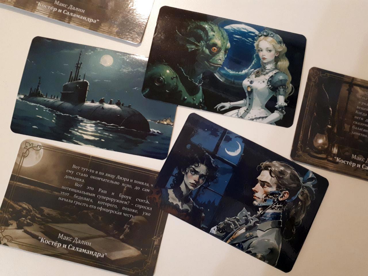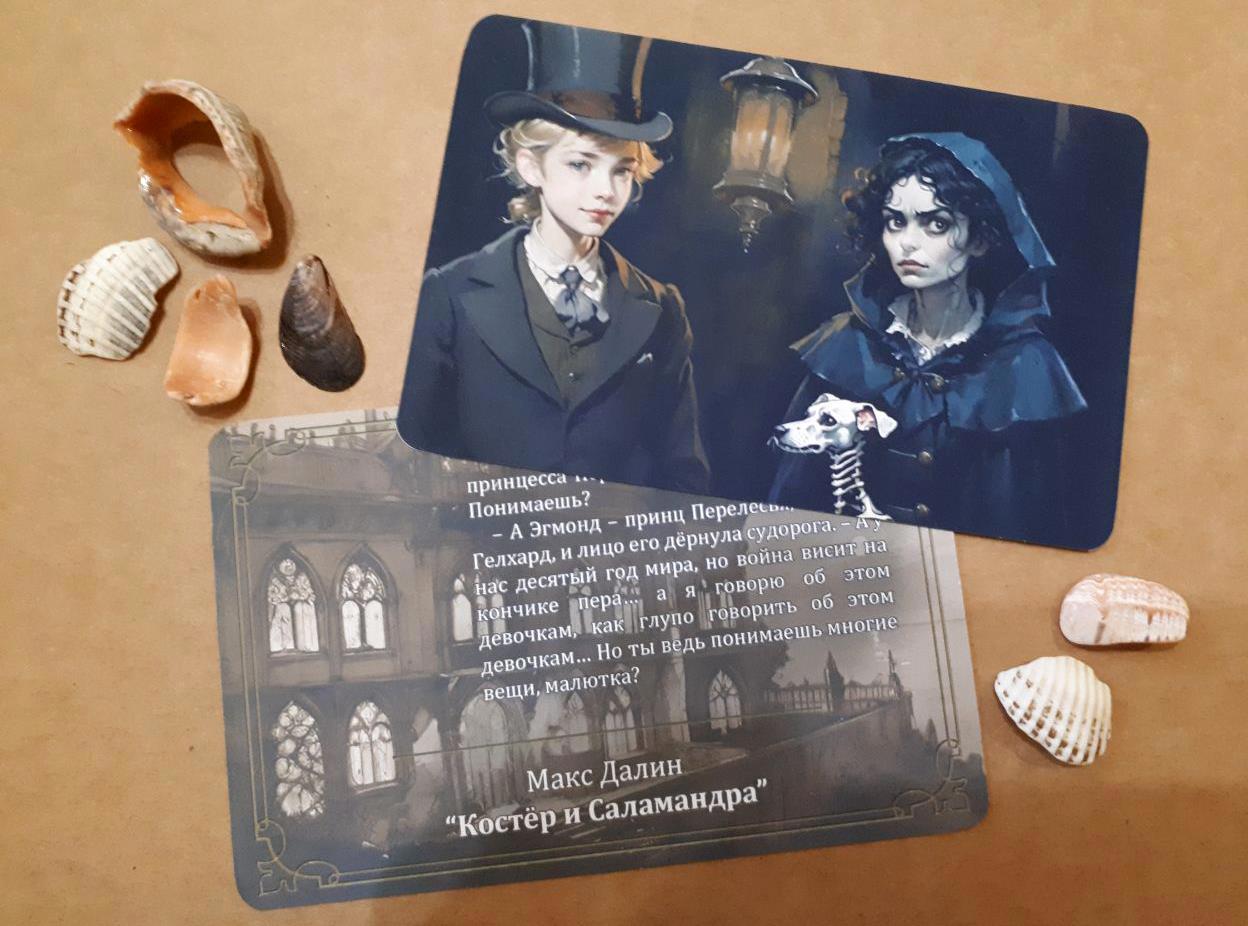 Таки да - это коллекция из 24 открыток к роману Макса Далина "Костёр и Саламандра". Автор делает иллюстрации при помощи нейросетей и Пейнта (о том, какие для этого требуются шаманские танцы с бубном, можно подробно почитать здесь, статьи вполне могут служить практическим пособием по добыванию картинок из нейросетки). Я взяла эти иллюстрации, подверстала к ним изнанку с картинкой в сепии и цитатой из романа - и вуаля!