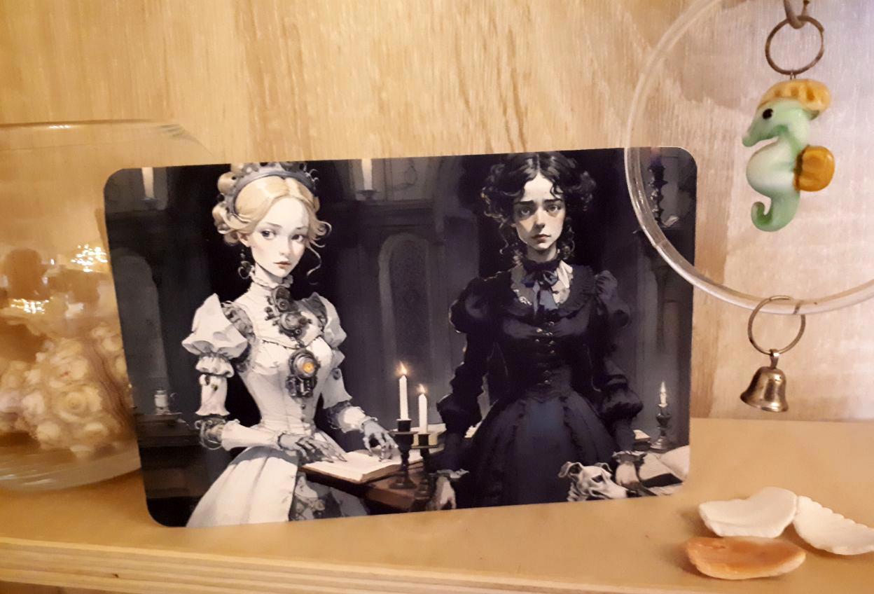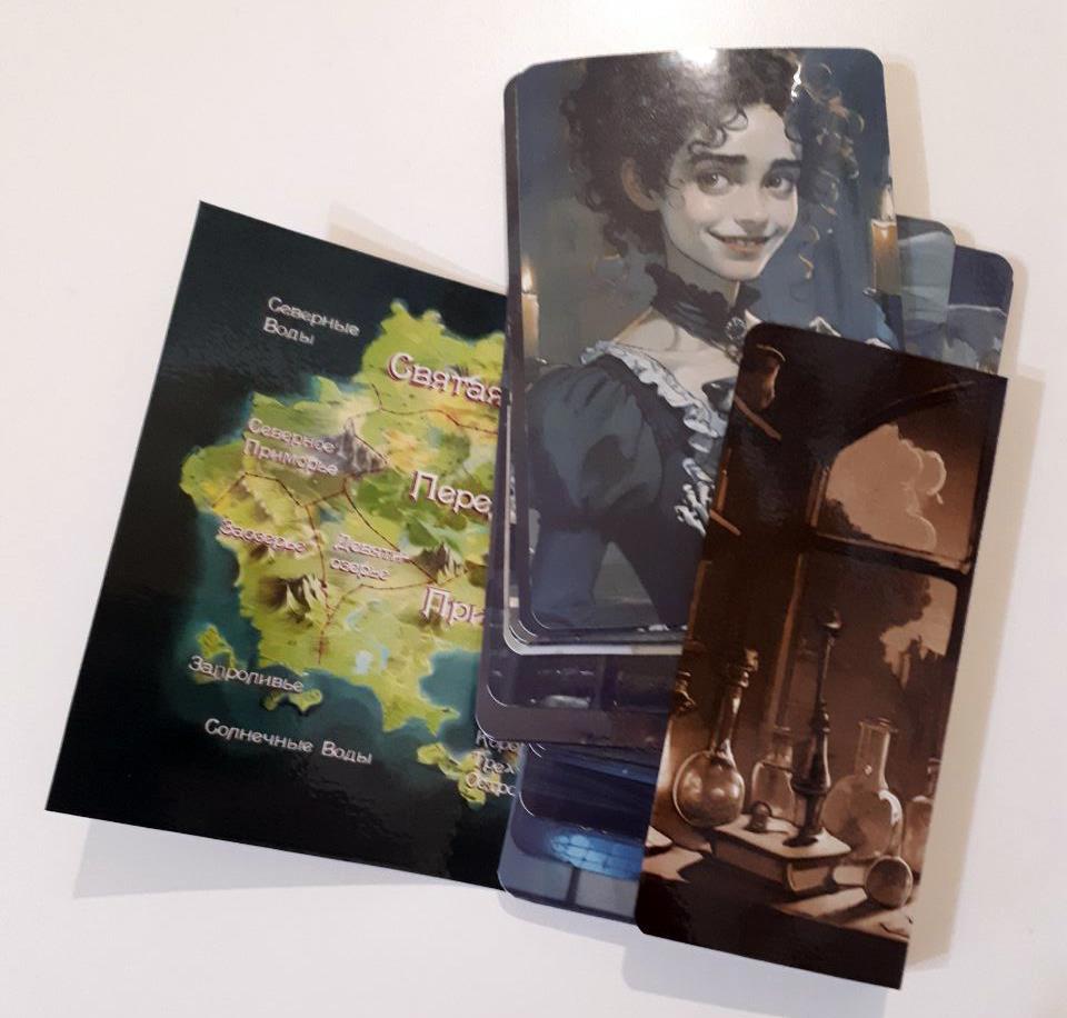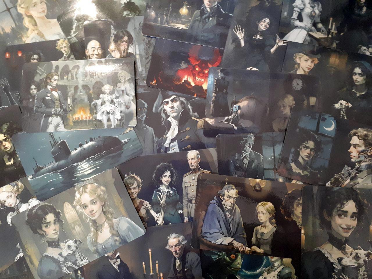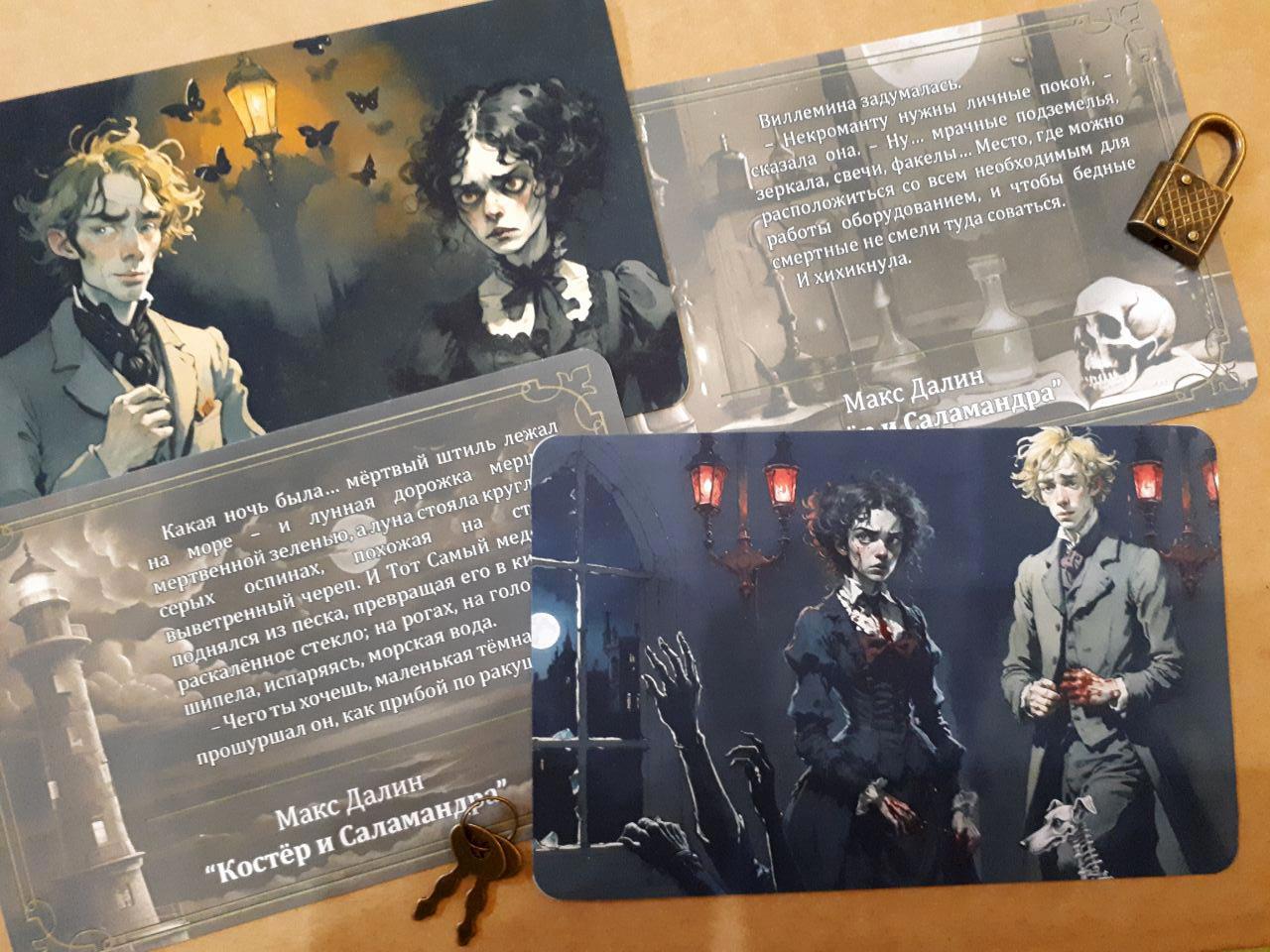 Таки да - это коллекция из 24 открыток к роману Макса Далина "Костёр и Саламандра". Автор делает иллюстрации при помощи нейросетей и Пейнта (о том, какие для этого требуются шаманские танцы с бубном, можно подробно почитать здесь, статьи вполне могут служить практическим пособием по добыванию картинок из нейросетки). Я взяла эти иллюстрации, подверстала к ним изнанку с картинкой в сепии и цитатой из романа - и вуаля!
