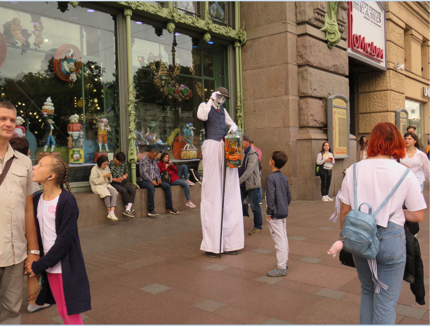 Вот и виден вход в театр рядом красиво оформленная витрина крупного магазина, что в центре не редкость. Живая статуя стоит на бойком месте, собирая довольно часто мелкую денежку.