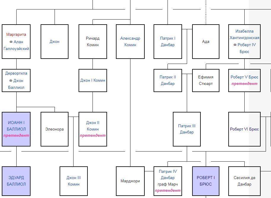 Эдуард тут сослался на английские законы по которым первое право признается всегда за первым ребенком (потомком Маргарет). Но шотландские законы давали приоритет самому ближнему родственнику (потомку Изабеллы). Однако такое нарушение правил не обеспокоило шотландских пэров, что видели в Баллиоле «своего», а в Брюсе – «полуангличанина». Именно это их согласие и привело потом к войне. Пэры и Стражи Шотландии не разгадали комбинации: