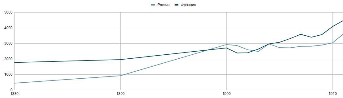 Вот график выплавки чугуна в тысячах тонн в сравнение РИ и Франции. При Витте Россия обгоняет Францию, вообще до кризиса у России самые высокие темпы роста в мире. В 1900-м начинается мировой кризис во время которого Франция вырывается вперед, а после кризисный подъем России обрывает война с Японией. Новый подъем с 1910 года уже оборвет ПМВ и революция.