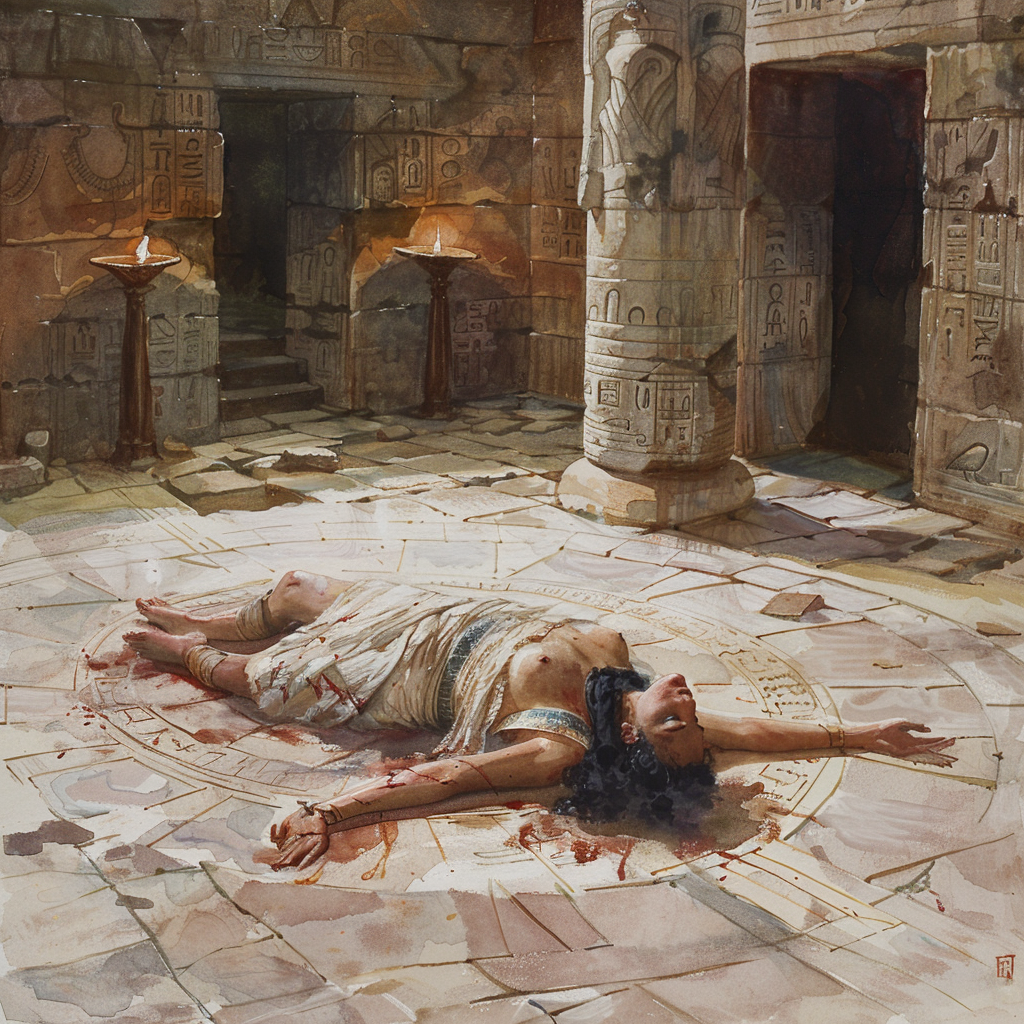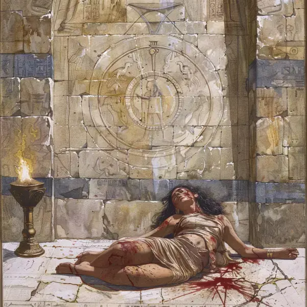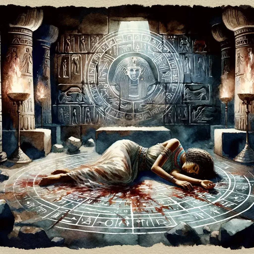 Женская фигурка, едва прикрытая окровавленными ошметками платья, скрючившись, лежала на каменном полу в центре очерченного белой краской круга. Факелы, вставленные в головки каменных змей, почти догорели, и теперь тлели красными точками, время от времени подергиваясь легким синеватым пламенем. Словно пытались снова вспыхнуть, но сил на это им уже не хватало. Теперь помещение освещали только несколько масляных ламп в половину человеческого роста.