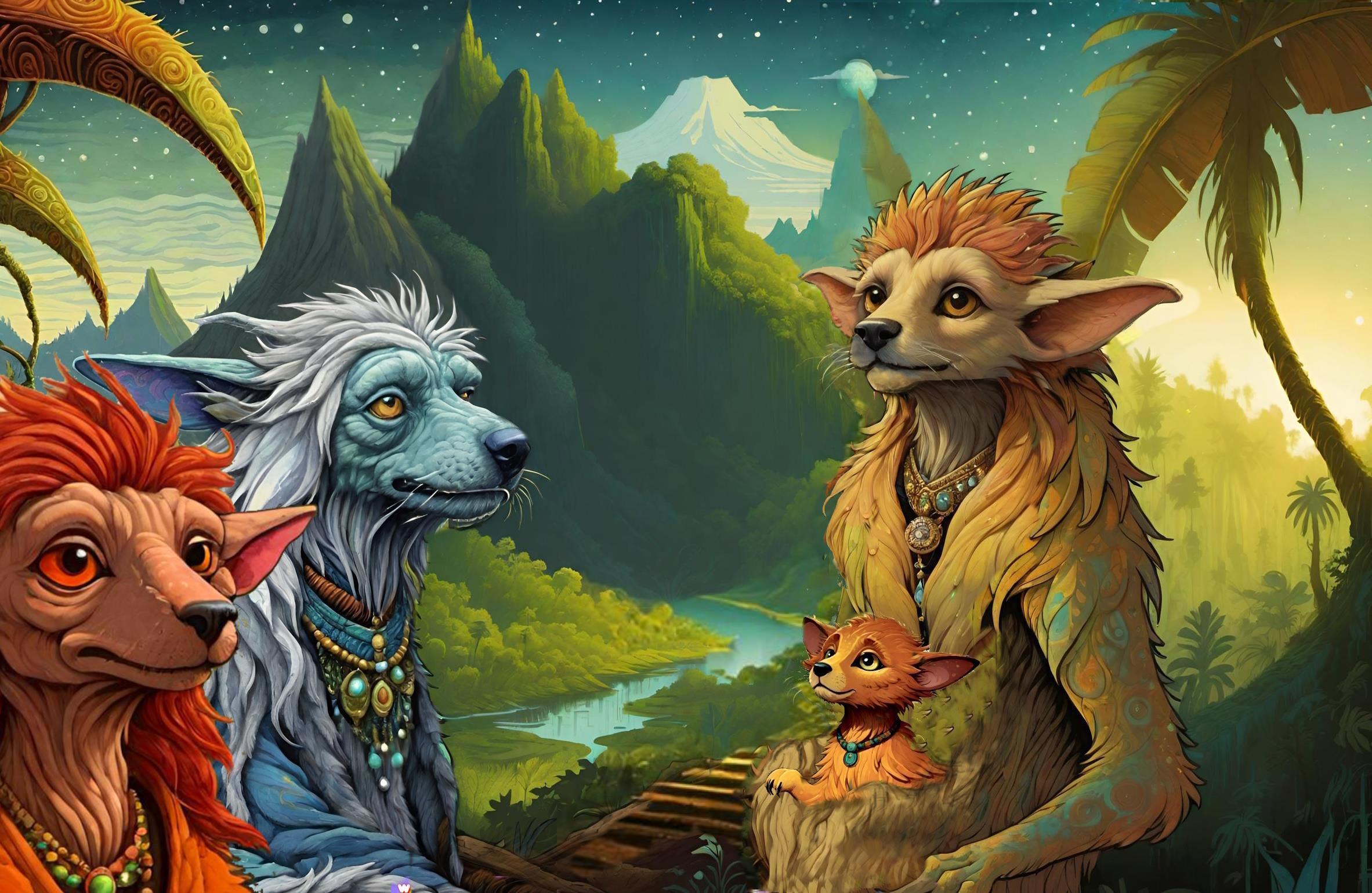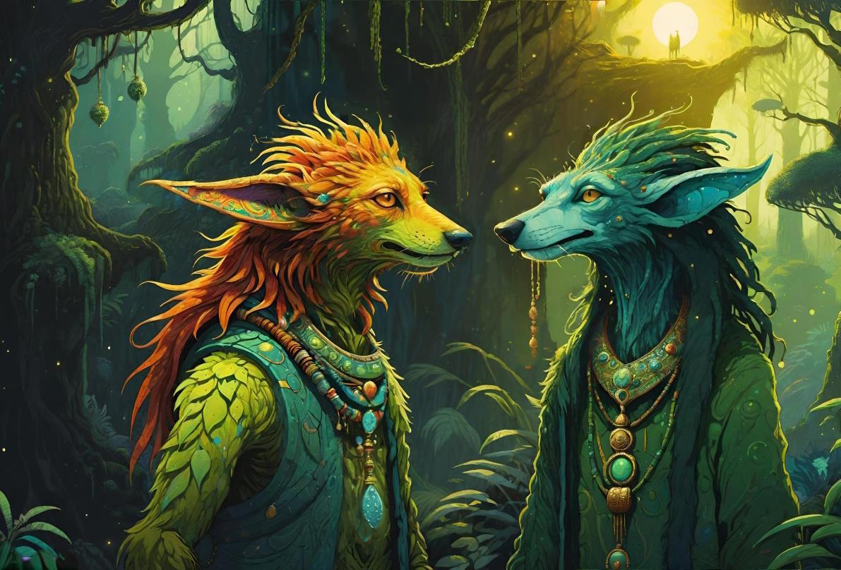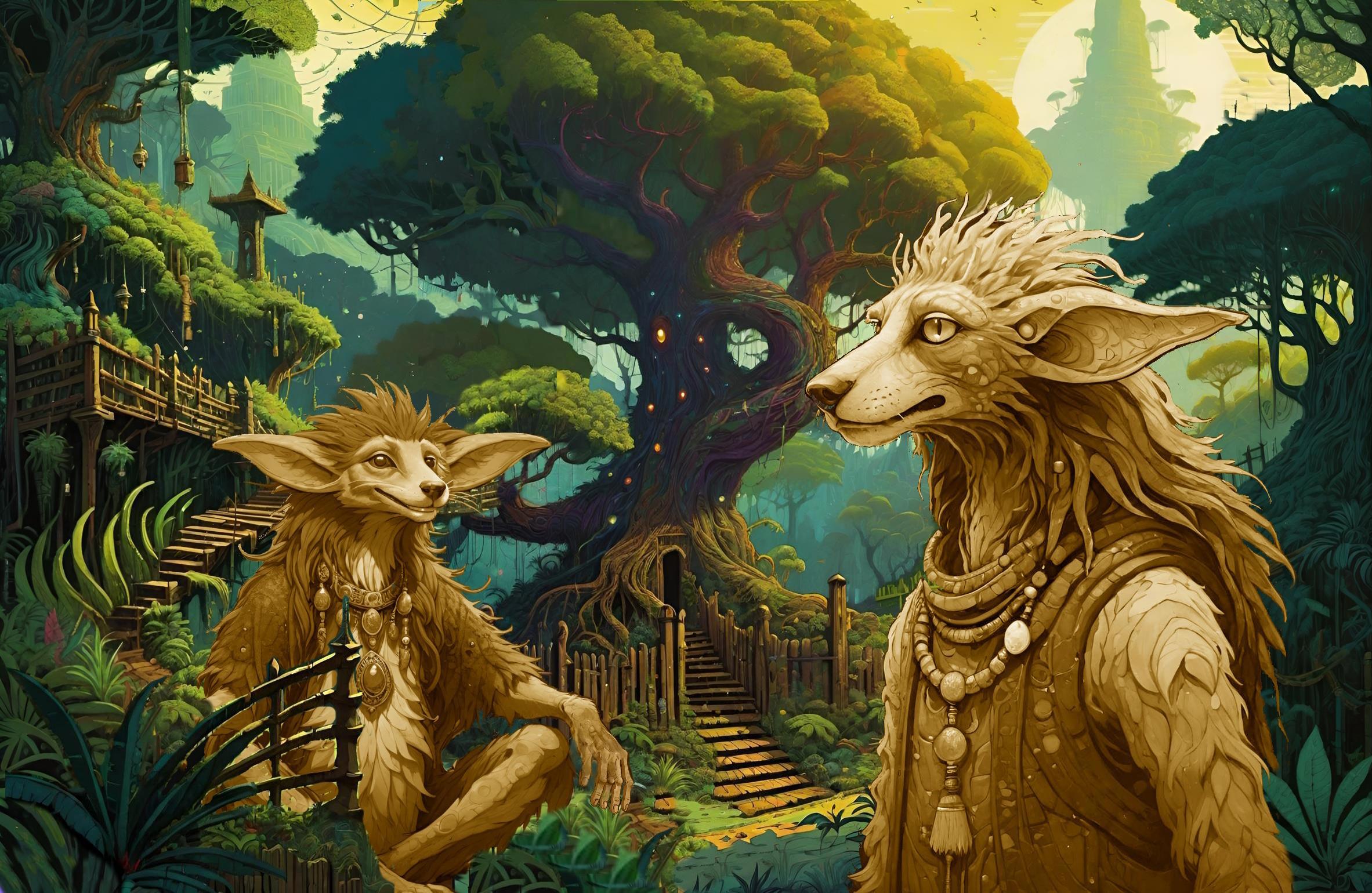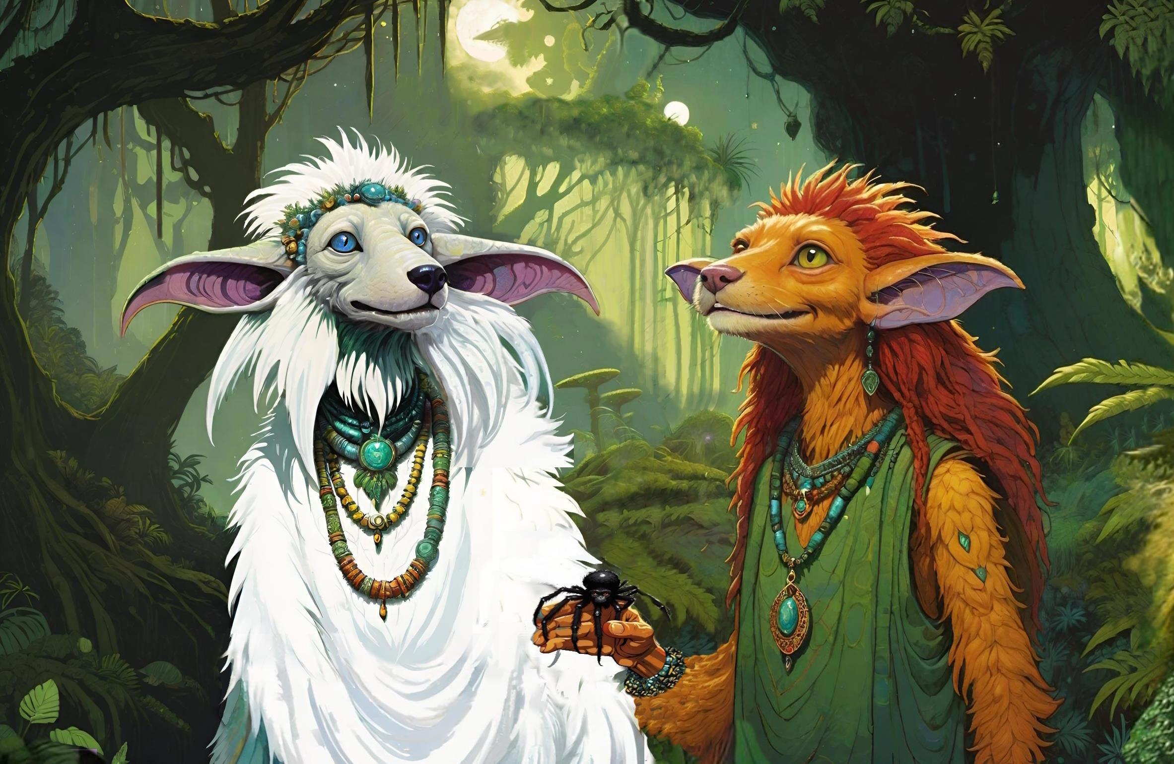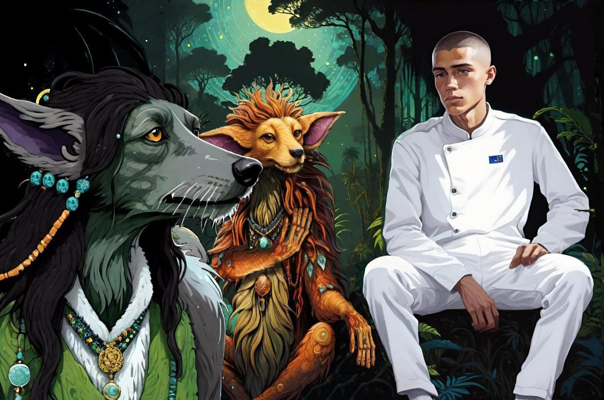 А люди сначала становятся гостями, потом - друзьями, а потом - своими. И следующий этап - это была попытка как-то соединить людей и лицин "в одном кадре". Ну, все, кто использовал нейросети, знают: обычно нейросеть пририсовывает человеку нечеловеческие уши и на том останавливается. Но мне нужен сюжет. Например, как Гзицино читает ароматическую поэму.