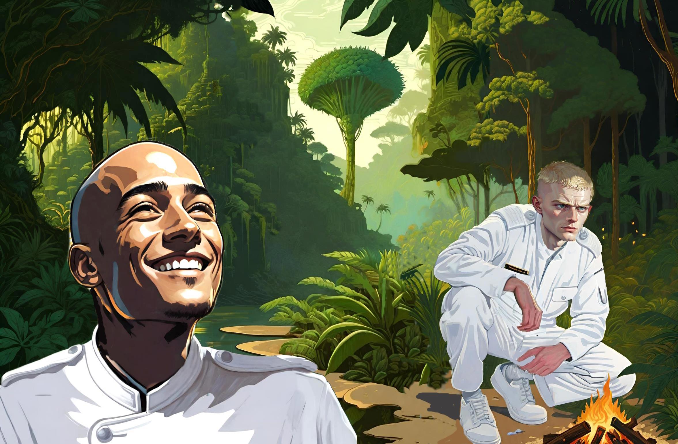 И я уже давно понял, что сам не смогу, а на нейросети очень мало надежды. Я уже убился о нейросети. Нейросеть не умеет нарисовать сколько-нибудь связную сценку. Нейросеть не может нарисовать четверых парней с разными лицами. Но мне мало, чтобы просто четвёрка - мне хочется, чтобы они там жили и что-то делали. Например, хоть чтобы Калюжный сумел разжечь костёр.