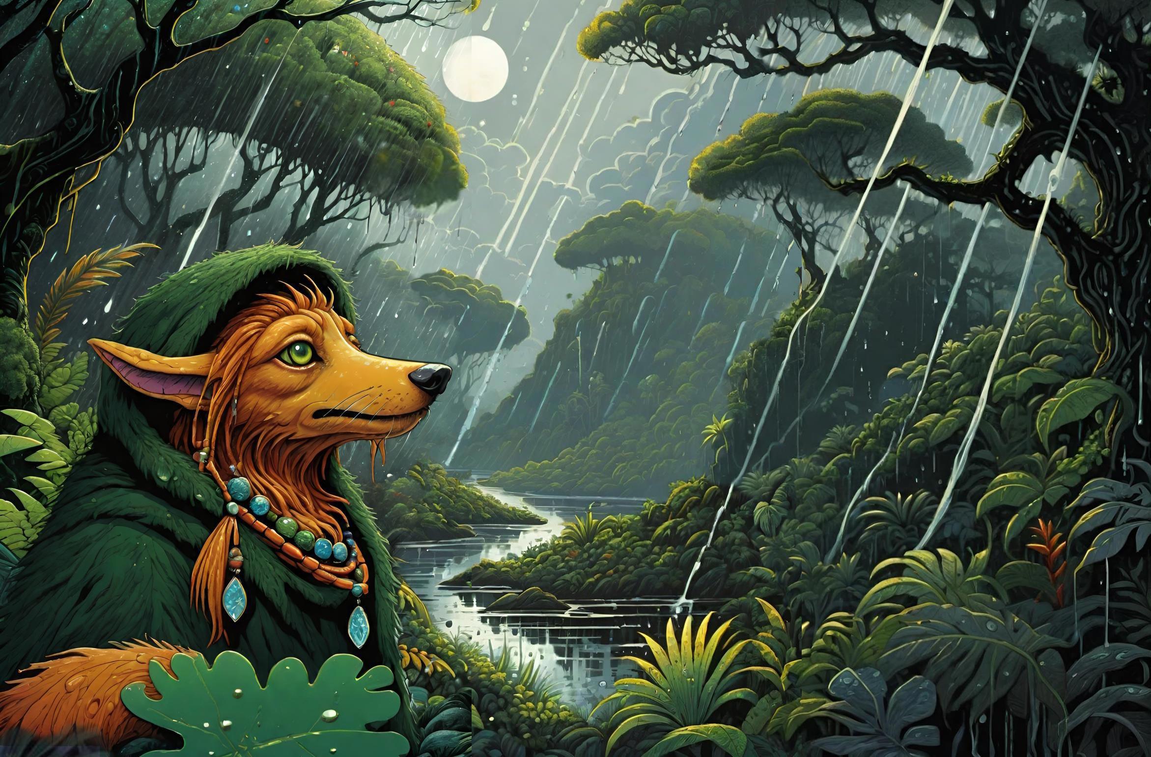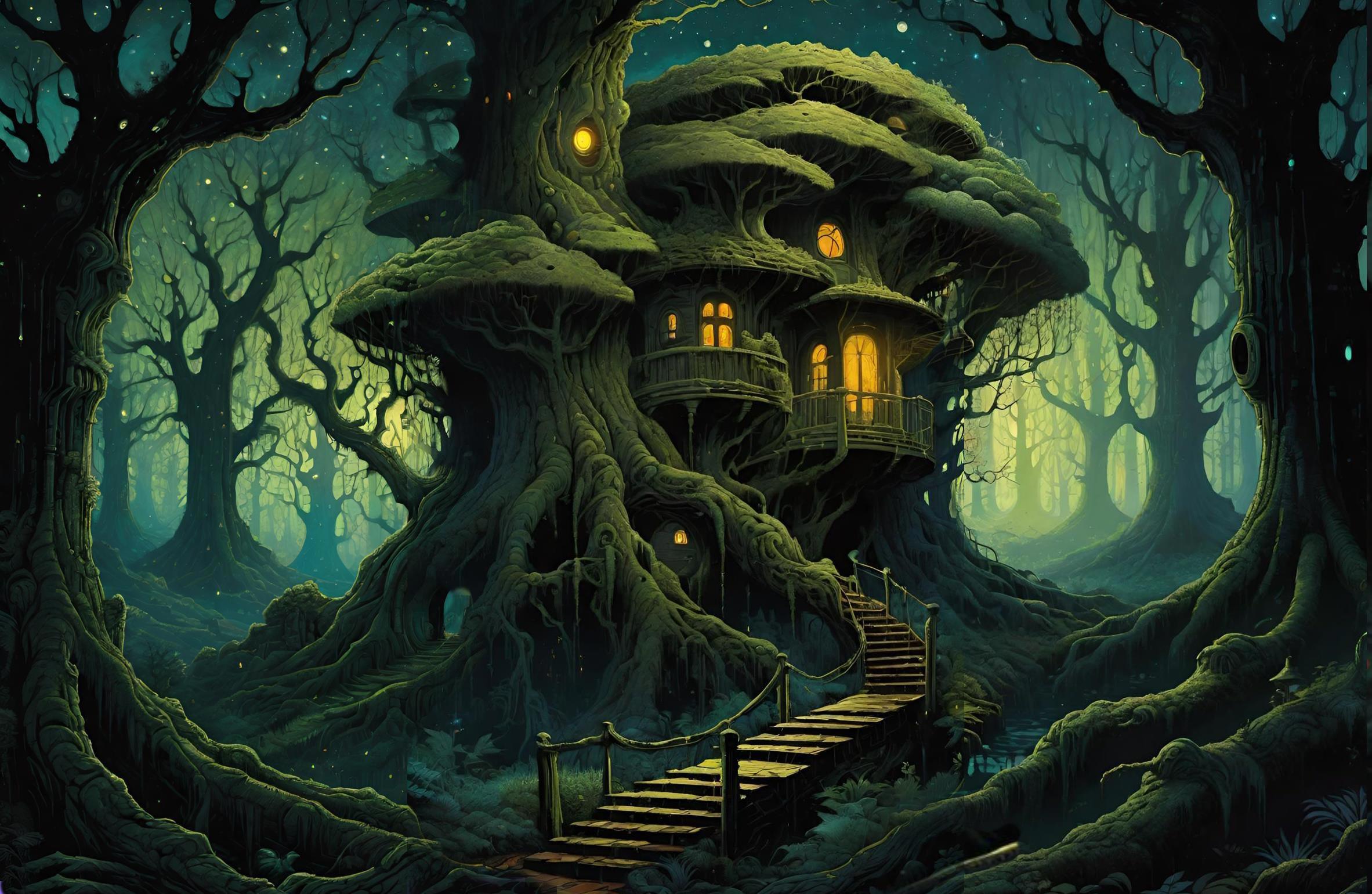 Их дом, вернее, лесную лабораторию микологов, оказалось не менее сложно изобразить, чем их самих. Нейросеть тянет инопланетное жилище в сторону обычного земного дома, я доделываю, перерисовываю по нейросетевой генерации и мы вместе создаём это самое жилище буквально по кусочкам. Но в итоге - всё-таки получилось, я переупрямил нейросеть.