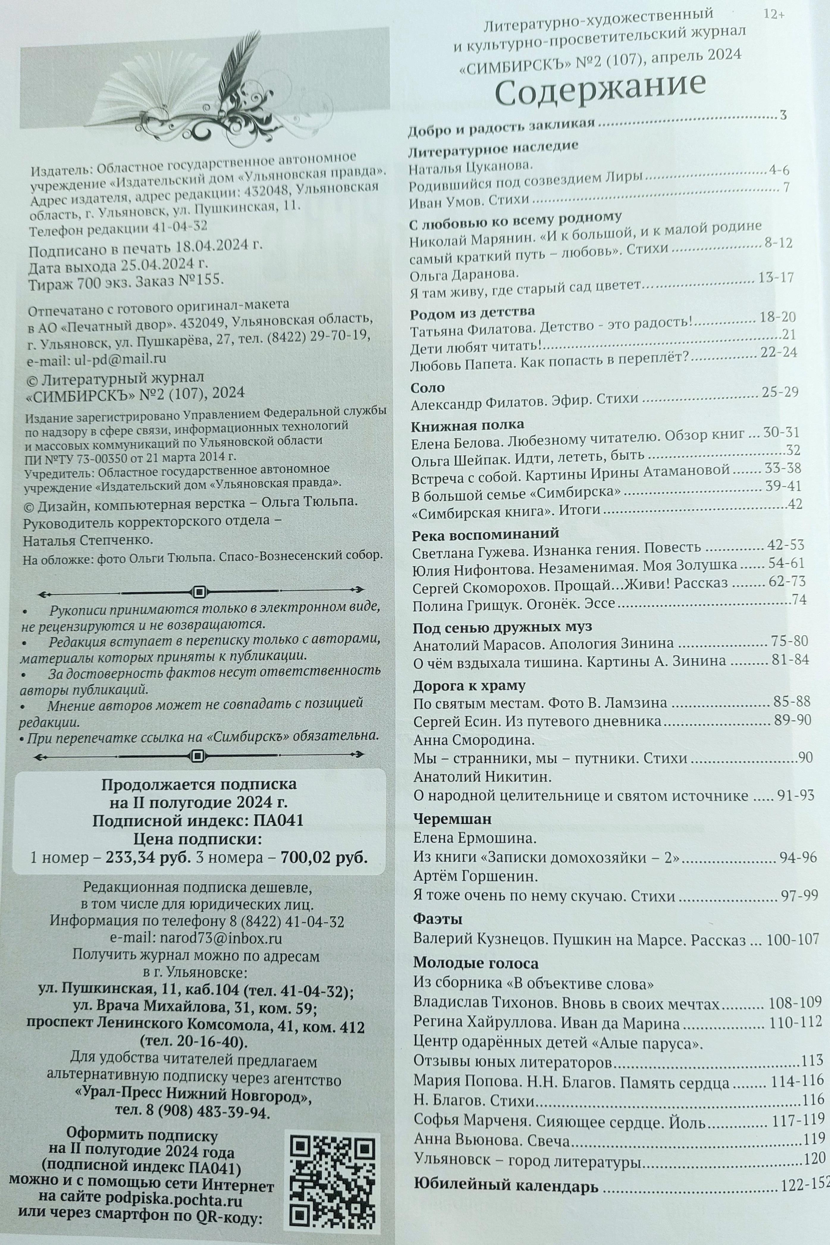 Автор: Юлия НифонтоваНедавно получила от почтальона прямо в руки новый номер литературного журнала "Симбирскъ" № 2 (107)/2024 (гл. ред. Е.В. Водкина)