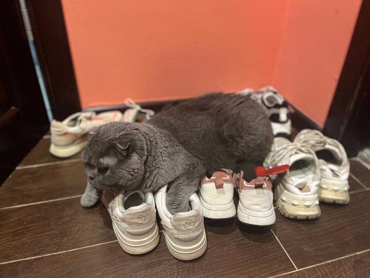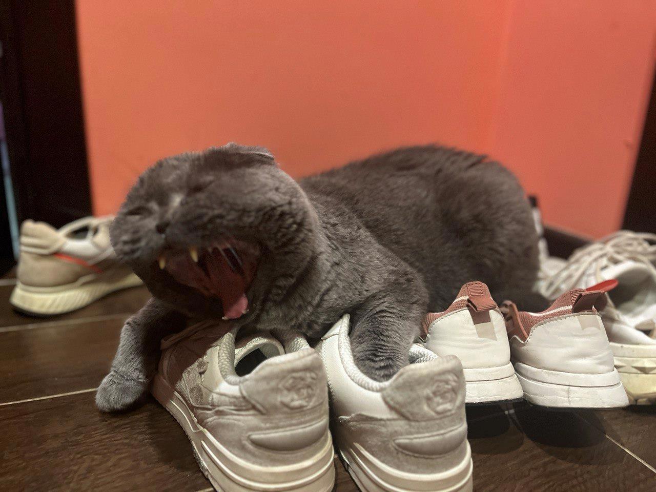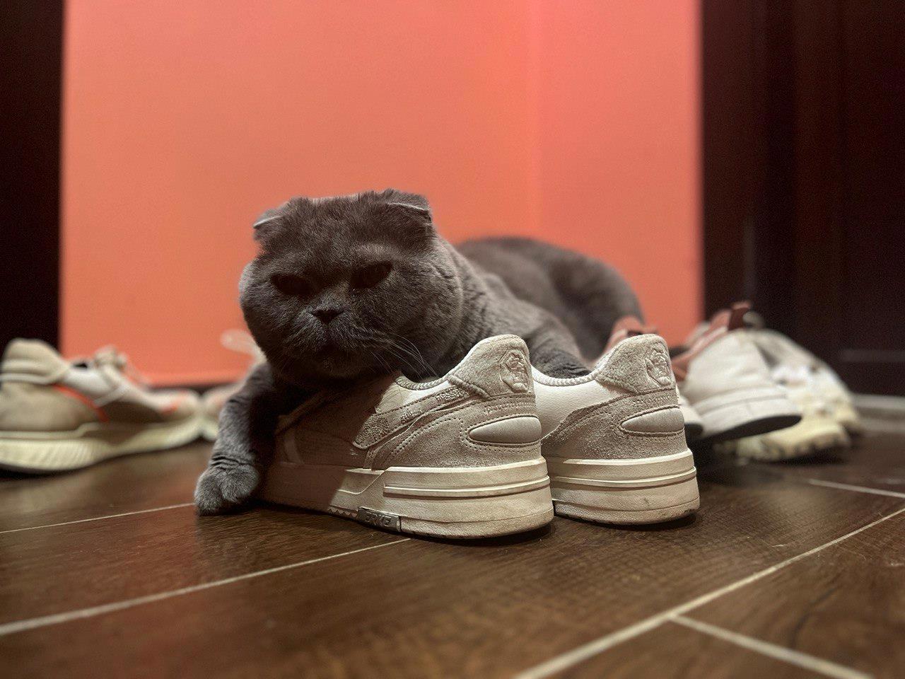 При более длительном наблюдении оказалось, что Ремарк ничего не точит и не портит, а просто лежит. Почему котик проводит часы, возлегая на кроссовках в прихожей, для меня остаётся загадкой.