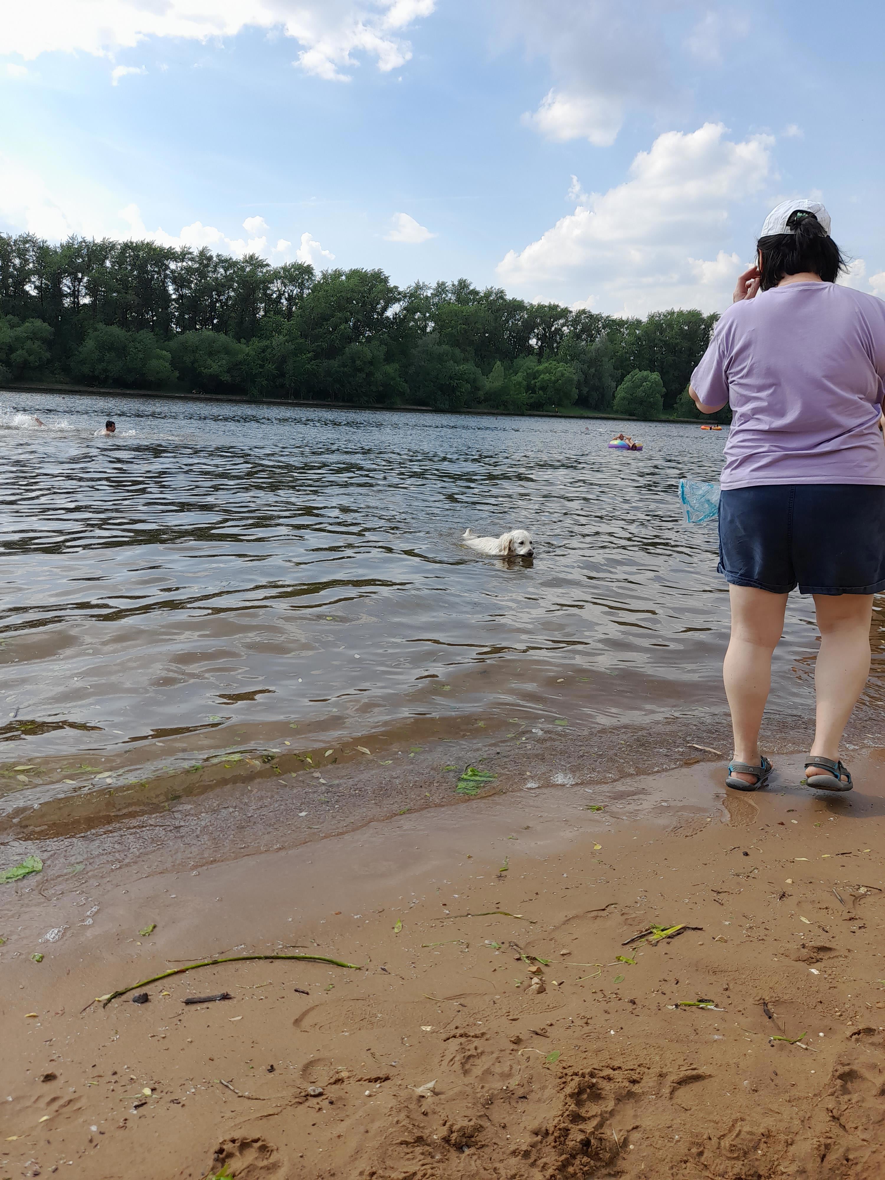 Посмотрела, как собакен играет с хозяйкой, притаскиавая ей брошенную в воду палку...