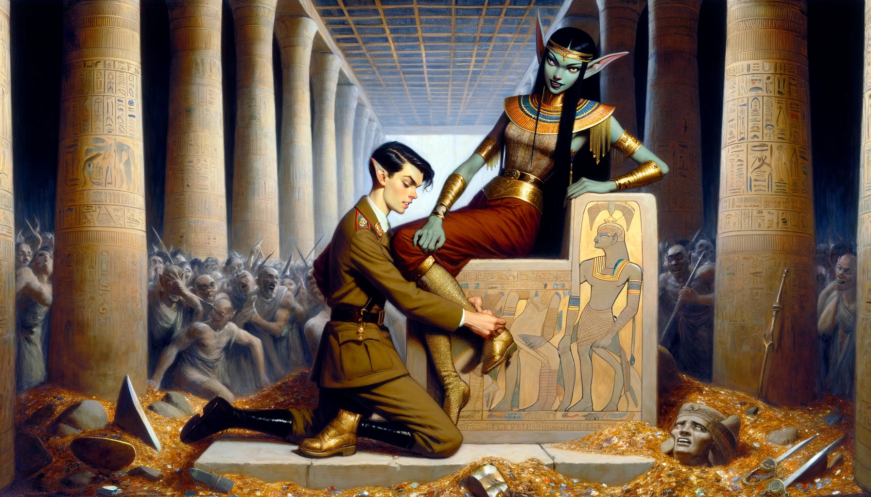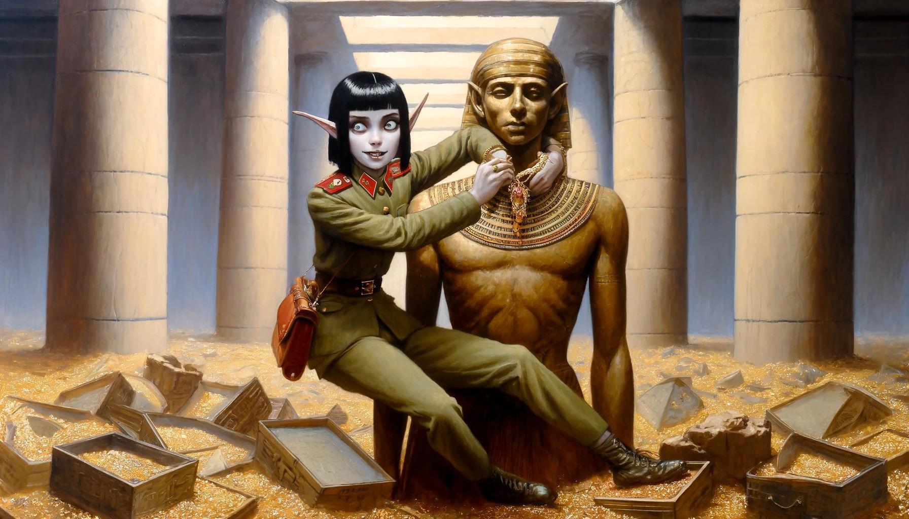 1Эльфийка с темными волосами. немного зомби. волосы прямые темные. выражение лица алчное. упираеться ногами в живот статуи пытаясь сорвать ожерелье золотое.