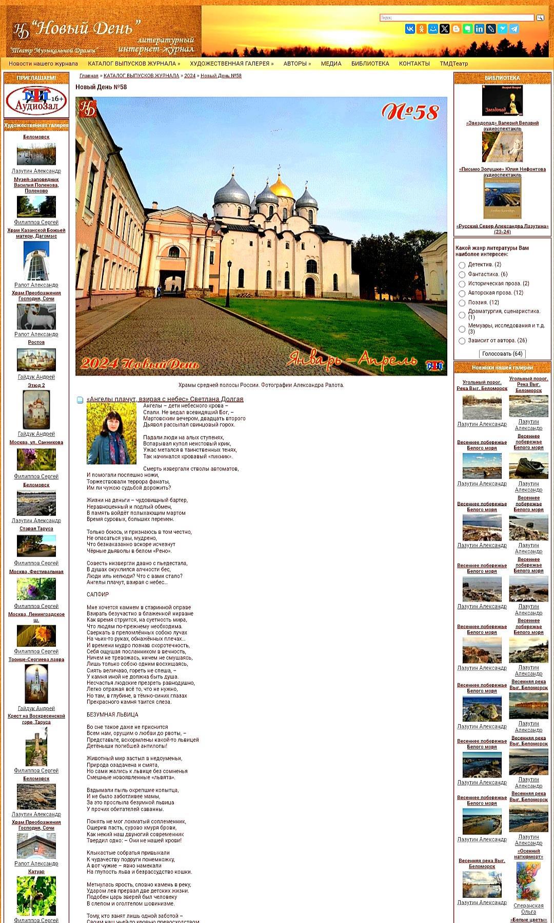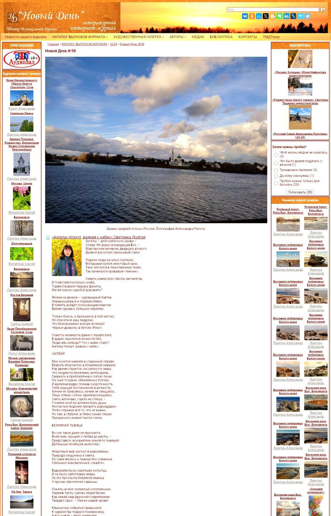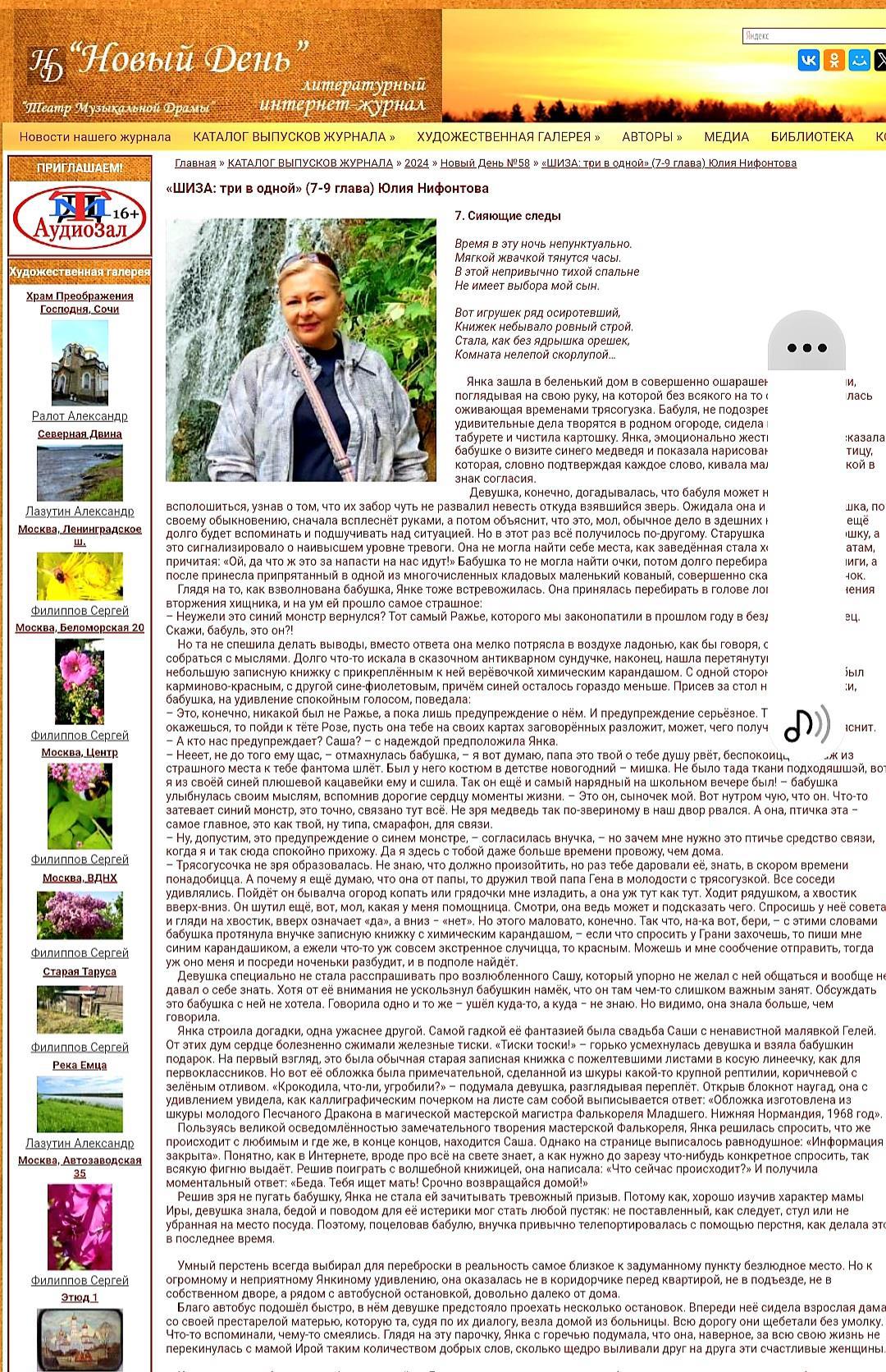 Литературный журнал "Новый День" № 58/2024 (Москва) продолжает публикацию моей повести "Шиза: три в одной" ( это третья часть мистической книжной серии "Шизариум"): https://noviden.tmdt.ru/katalog-vypuskov-zhurnala/2024/novyi-den-58/-shiza-tri-v-odnoi-7-9-glava-yulija-nifontova.html