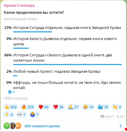 Проголосовало более 5000 человек, это всего лишь четверть следящих за подпиской на разных порталах, но самая активная часть аудитории, поэтому итоги можно считать репрезентативными. Проголосуй даже все читатели, (что из области фантастики) пропорция бы не сильно изменилась.
