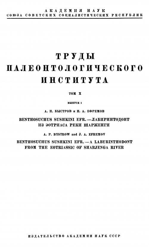 Быстров А. П., Ефремов И. А. Bentosuchus sushkini Efr. — лабиринтодонт из эотриаса р. Шарженги. М.: Изд-во АН СССР, 1940. 152 с. (Тр. ПИН АН СССР; Т. 10. Вып. 1)