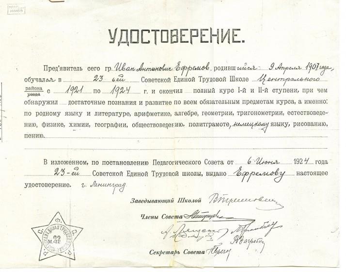 В 1921 году, после демобилизации, Иван Ефремов в тринадцать лет уезжает в Петроград с твёрдым намерением учиться. Благодаря бескорыстной помощи учителей он окончил школу за два с половиной года. Говорил, что именно революция освободила его от мещанства.