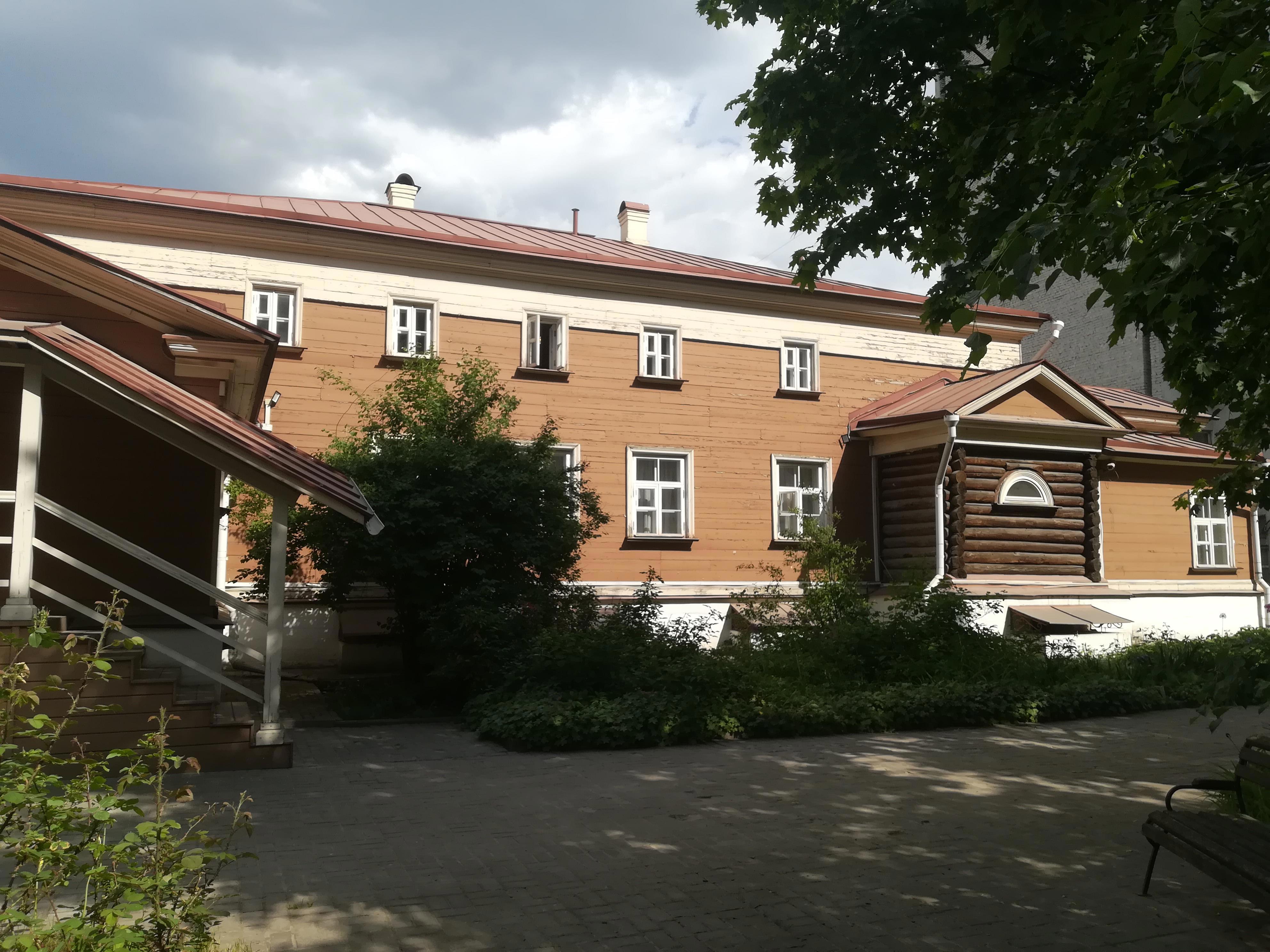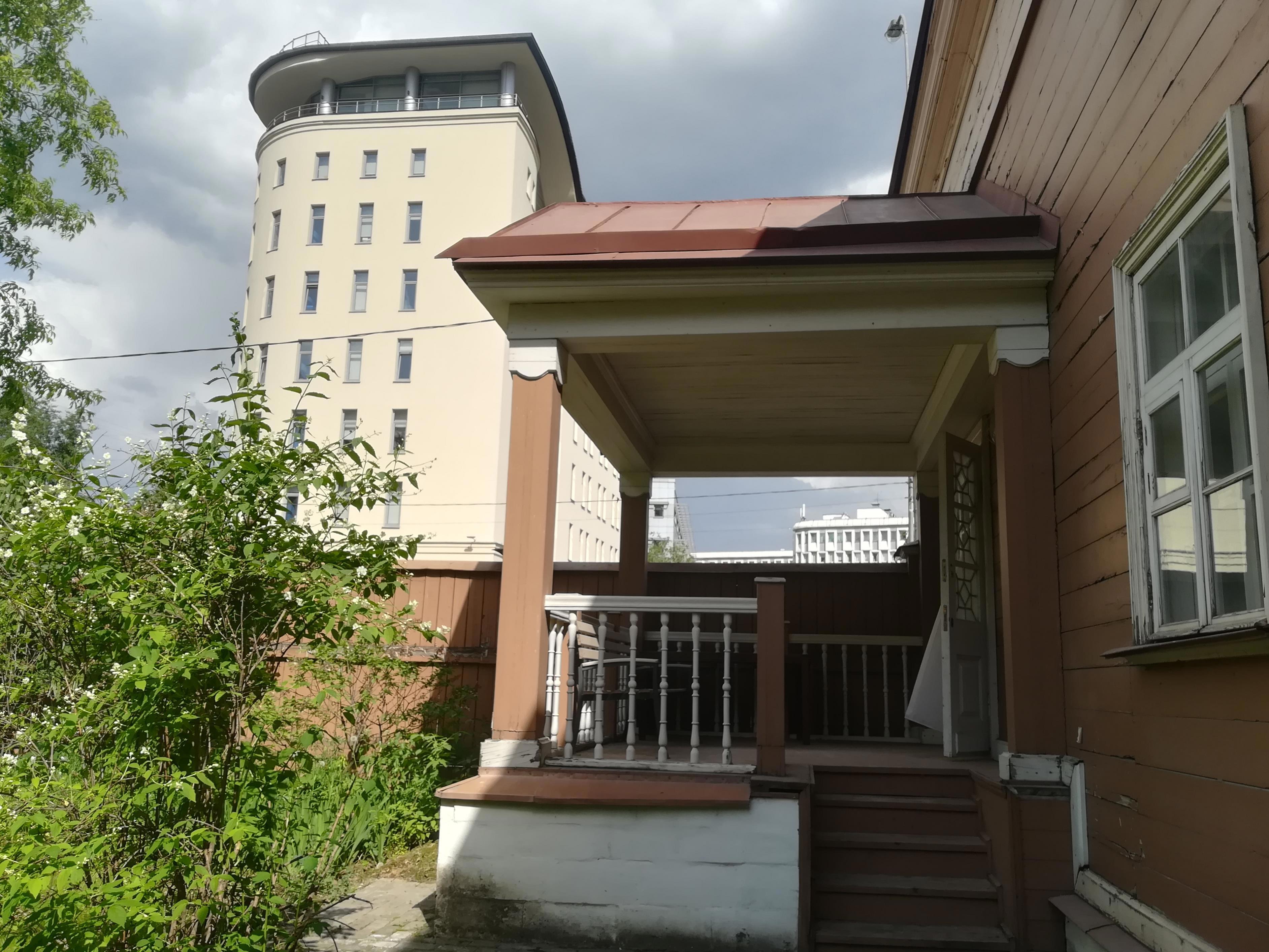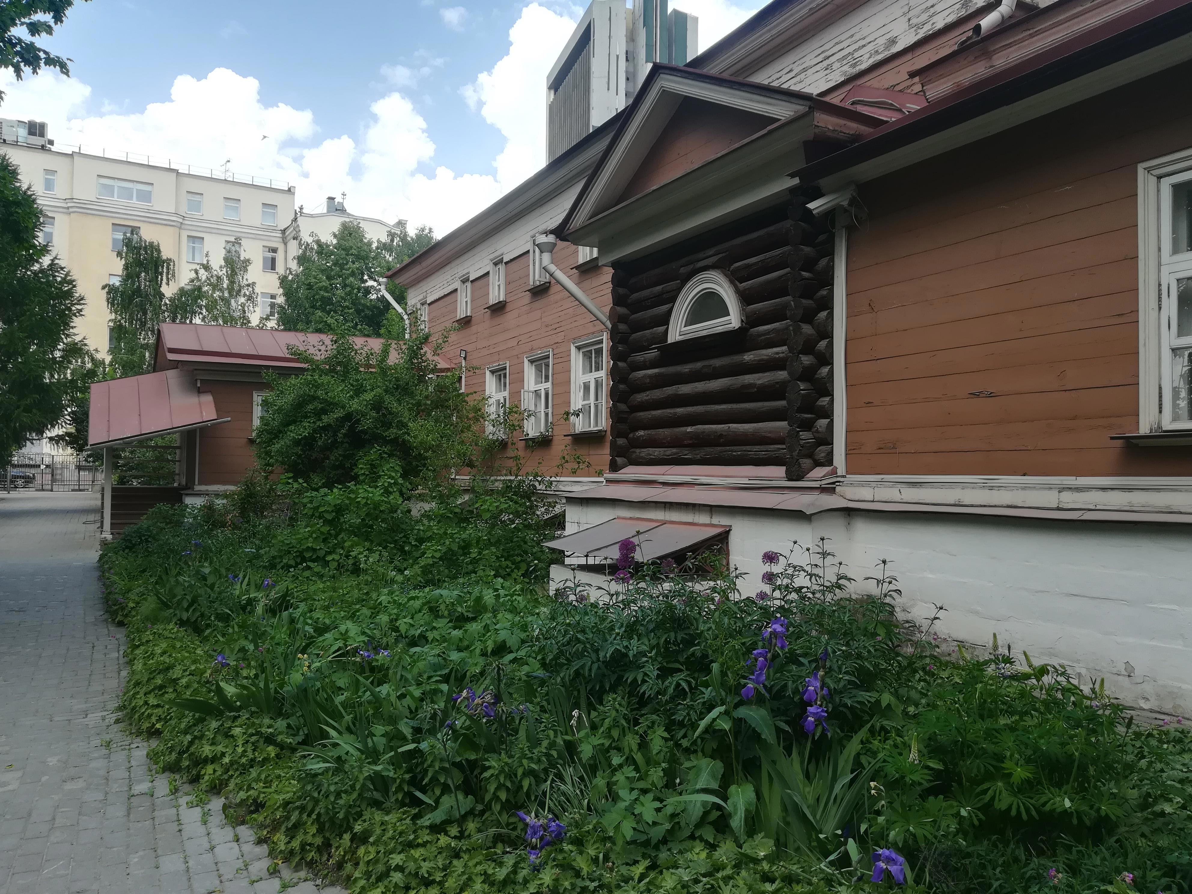 Маленький на фоне остальных зданий такой купеческий домик с садом.