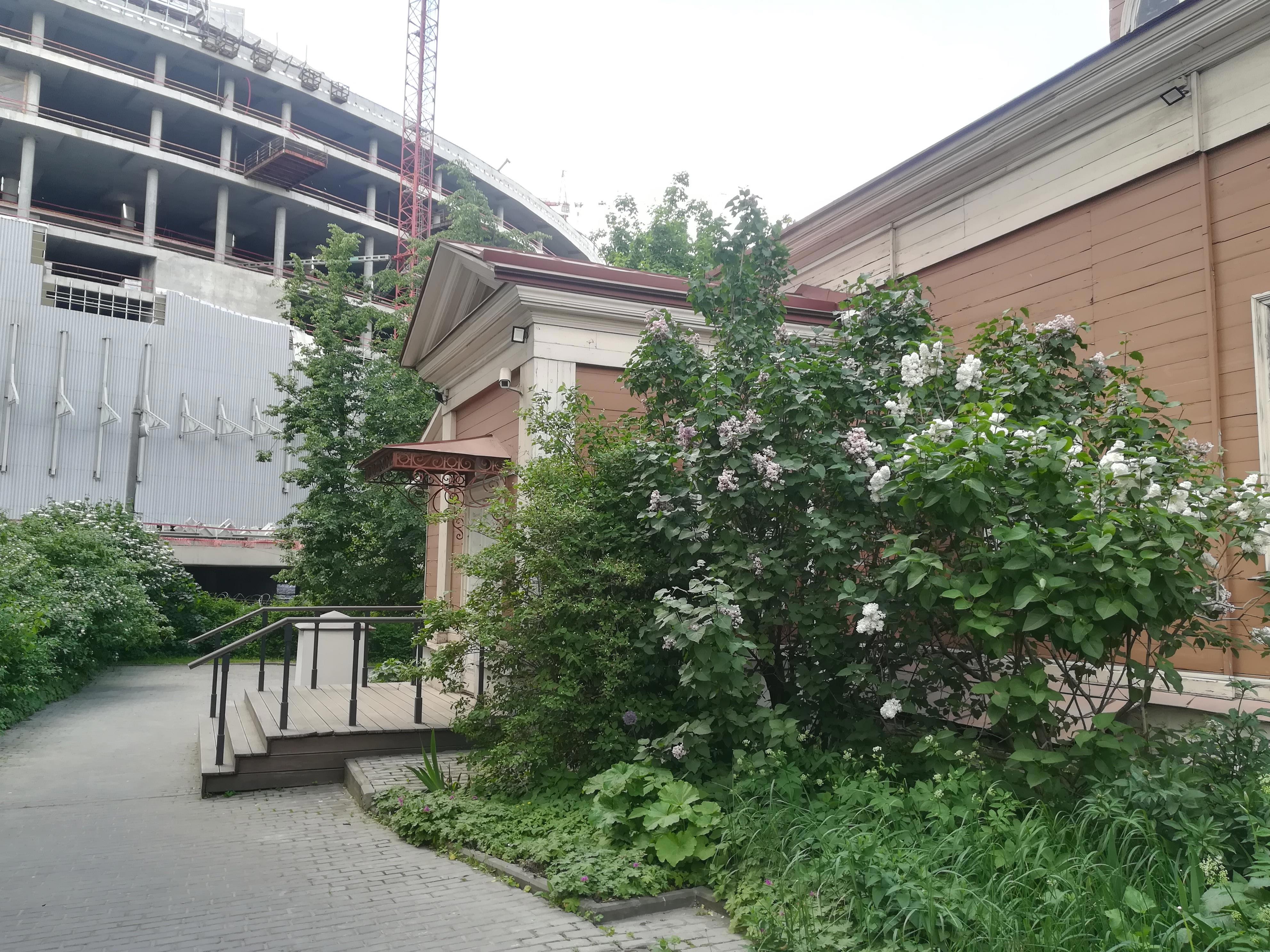 Иду, слева строят Олимпийский, шум на всю улицу, и вдруг пение птиц, бедняжки пытались перекричать стройку, и аромат сирени мне вдогонку. Я остановилась и обратила внимание на дом-музей Щепкина М. С.. Думаю, а зайду. Сколько раз я мимо него в МОНИКИ ходила и фотографировала много раз, почему бы и нет.