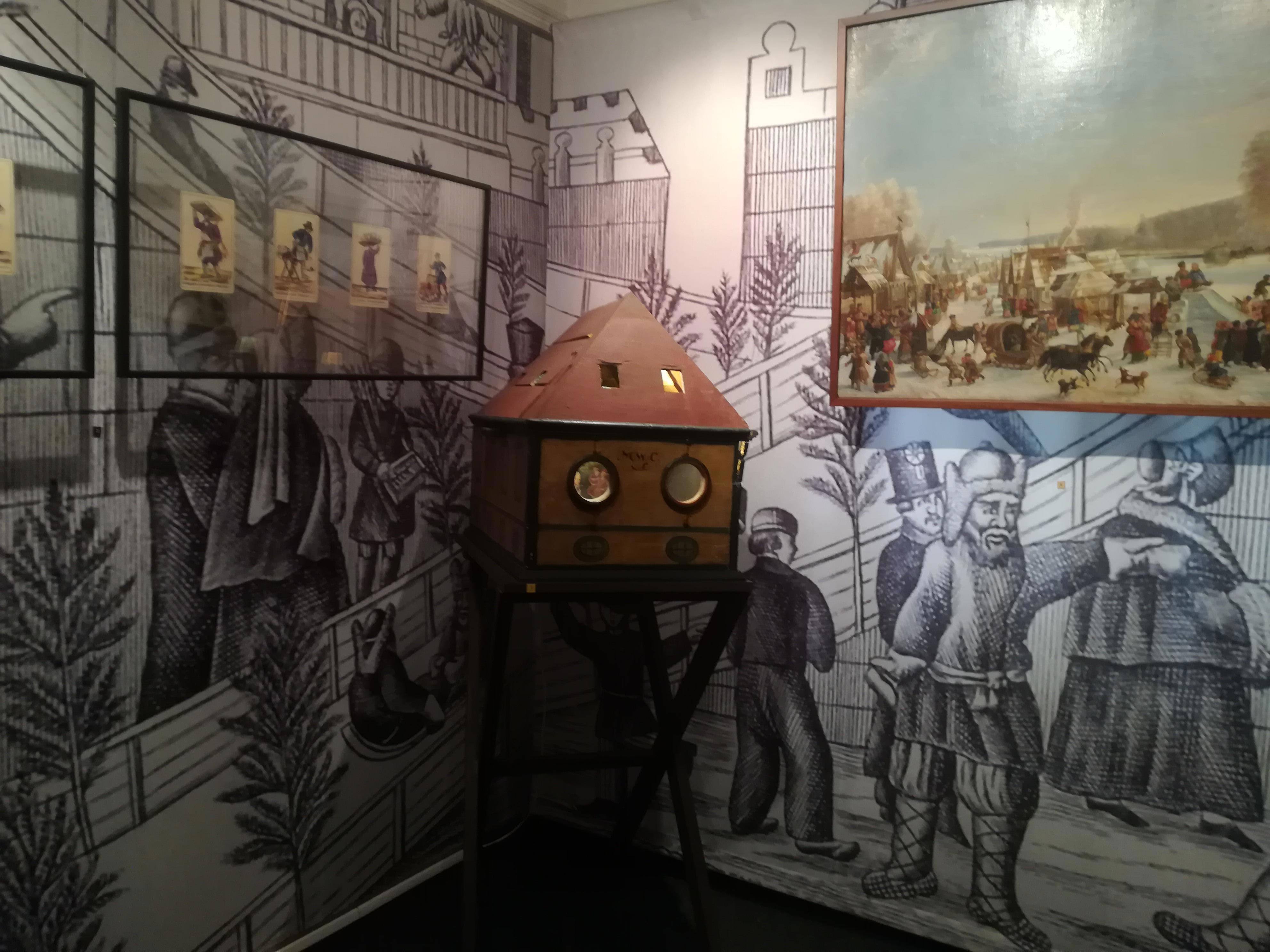 Немецкий раёк, 1900г, дерево, роспись маслом, стекло. В старину - ящик с передвижными картинками, на которые зрители смотрели через увеличительное стекло. Показ картинок сопровождался шутками и прибаутками от хозяина райка.