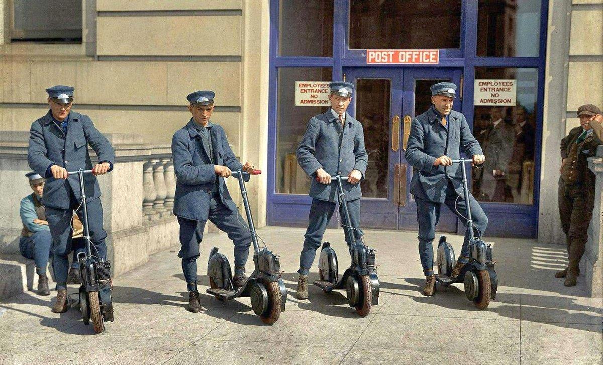Их осчастливили этими штуками их начальники. Не шуточки - 100 зелёных за штуку! Теперь вы поняли, почему мне это показалось таким привычным и знакомым, хотя снимок сделан в 1917 году? Разумеется на них катались не только почтари, но и эмансипированные дамы:
