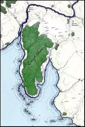 Эрин Ворн, что означает Чернолесье – полностью покрытый лесом полуостров в южном Эриадоре. Представляя собой западную оконечность Минхириата, Эрин Ворн изначально был частью обширного древнего леса, некогда покрывавшего большую часть северо-запада Средиземья. Название своё он получил от нуменорских путешественников Второй Эпохи.