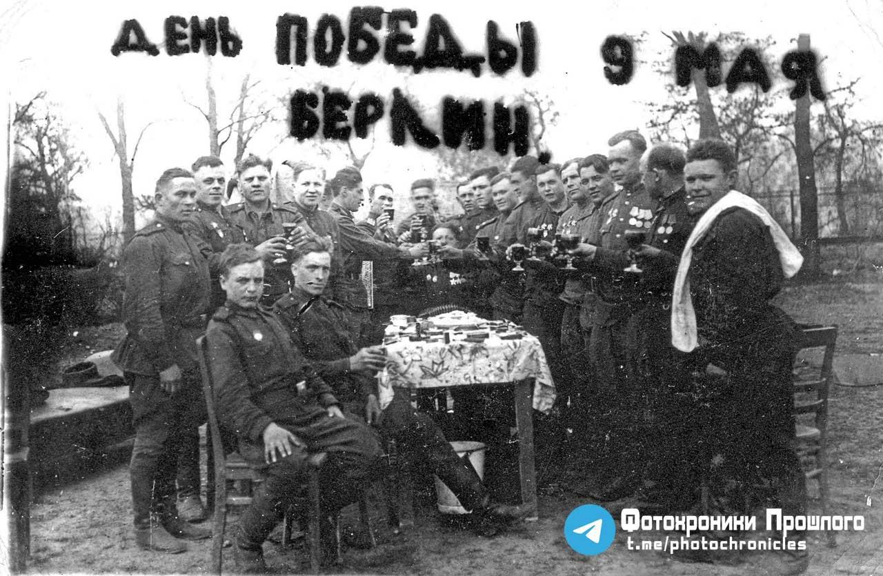 На фото можно видеть, как мы в Берлине праздновали Победу. На снимке я перекрыт слева головой с высокой шевелюрой — это Юрка Энтис. Видно только мое ухо (самое большое огорчение моей жизни:-)). Наутро мы покинули Берлин, а наш парк вошел потом в английский сектор города.»(с)