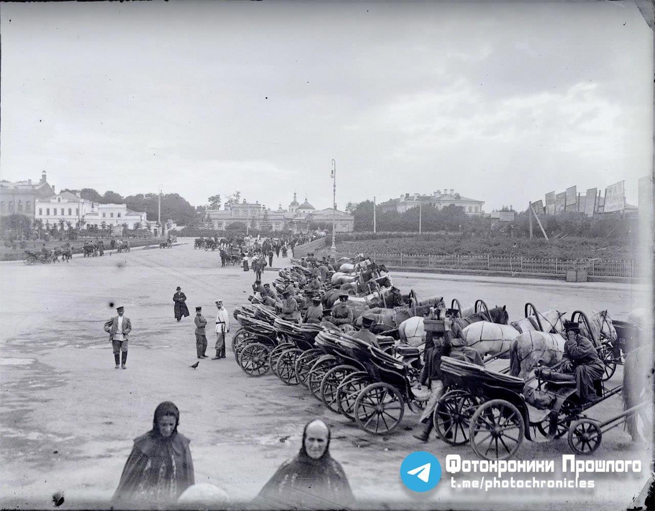 Москва, Курский вокзал, огромное количество извозчиков, дожидающихся прибытия поезда. 1910 г.