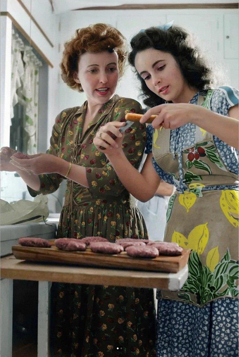 Актриса Элизабет Тейлор со своей мамой Сарой Созерн жарят котлеты для гамбургеров, 1947 год