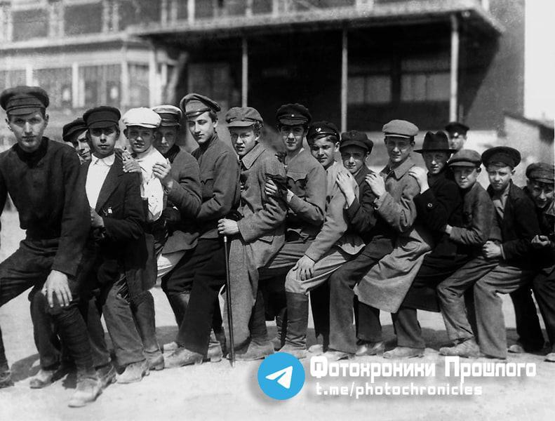 Петроград 1918 год, призывники в Красную Армию показывают модный в то время способ как на 1 табуретке сидеть целым взводом.
