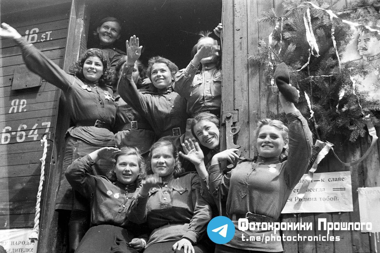 Демобилизованные советские девушки-военнослужащие, отправляющиеся из Германии в СССР. Обратите внимание, что в ПВУ кадра виден портрет Сталина в обрамлении хвойных веток.