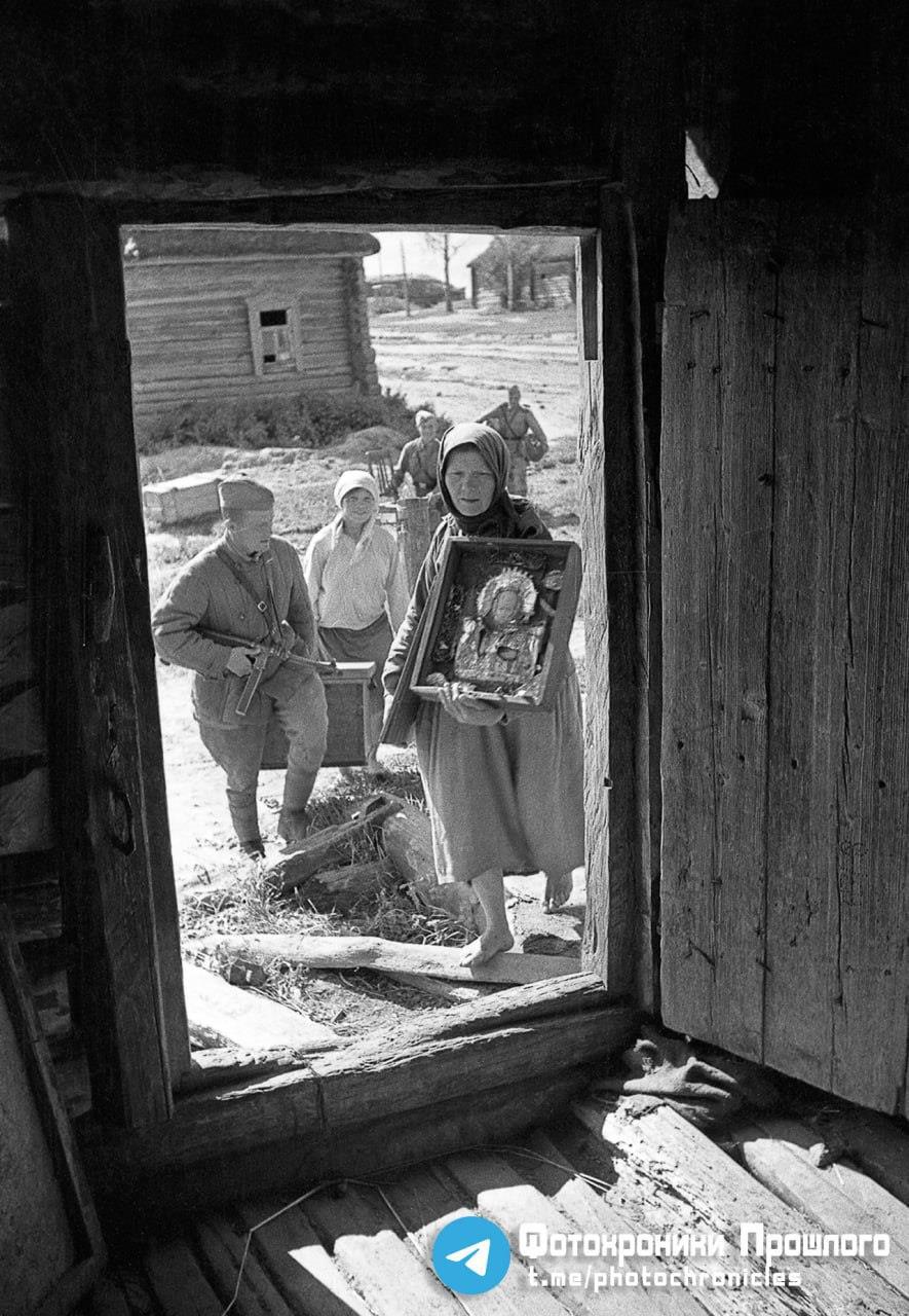 Нижнее Блевково было освобождено 13 августа 1943 года. На снимке запечатлен счастливый момент возвращения колхозницы Беликовой и её родных после освобождения деревни от немецкой оккупации.
