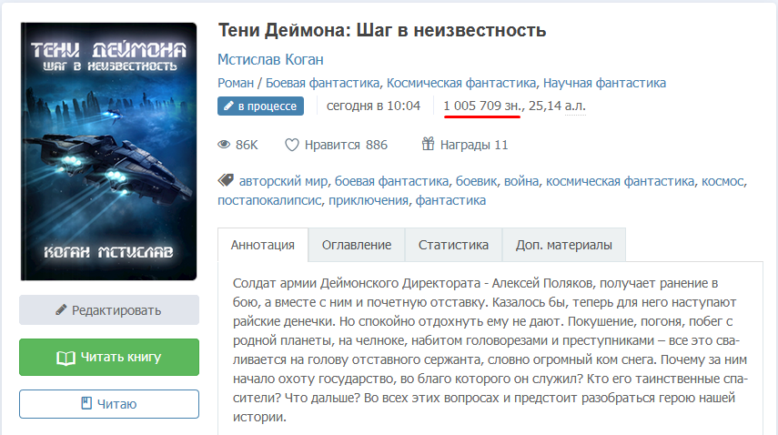 Этот объем я писал чуть больше, чем год. Да, теперь уже можно сказать, что была проделана огромная работа. Любимая работа, которая, как я надеюсь, в ближайшем будущем для меня станет оплачиваемой и основной, если вообще не единственной. Возможно для кого-то такая скорость не бог весть что, но для меня это огромный рывок вперед. И в ближайшее полугодие мне надо сделать еще один такой же рывок, увеличив скорость написания книги в два раза (ибо срок платной подписки – шесть месяцев), но, не уронив при этом уровень качества. Что ж… посмотрим, как оно пойдет. Ну и немножко о будущих планах, раз уж такая пьянка пошла. Как, я уже писал в группе: ни на что не намекаю, но, возможно, скоро)
